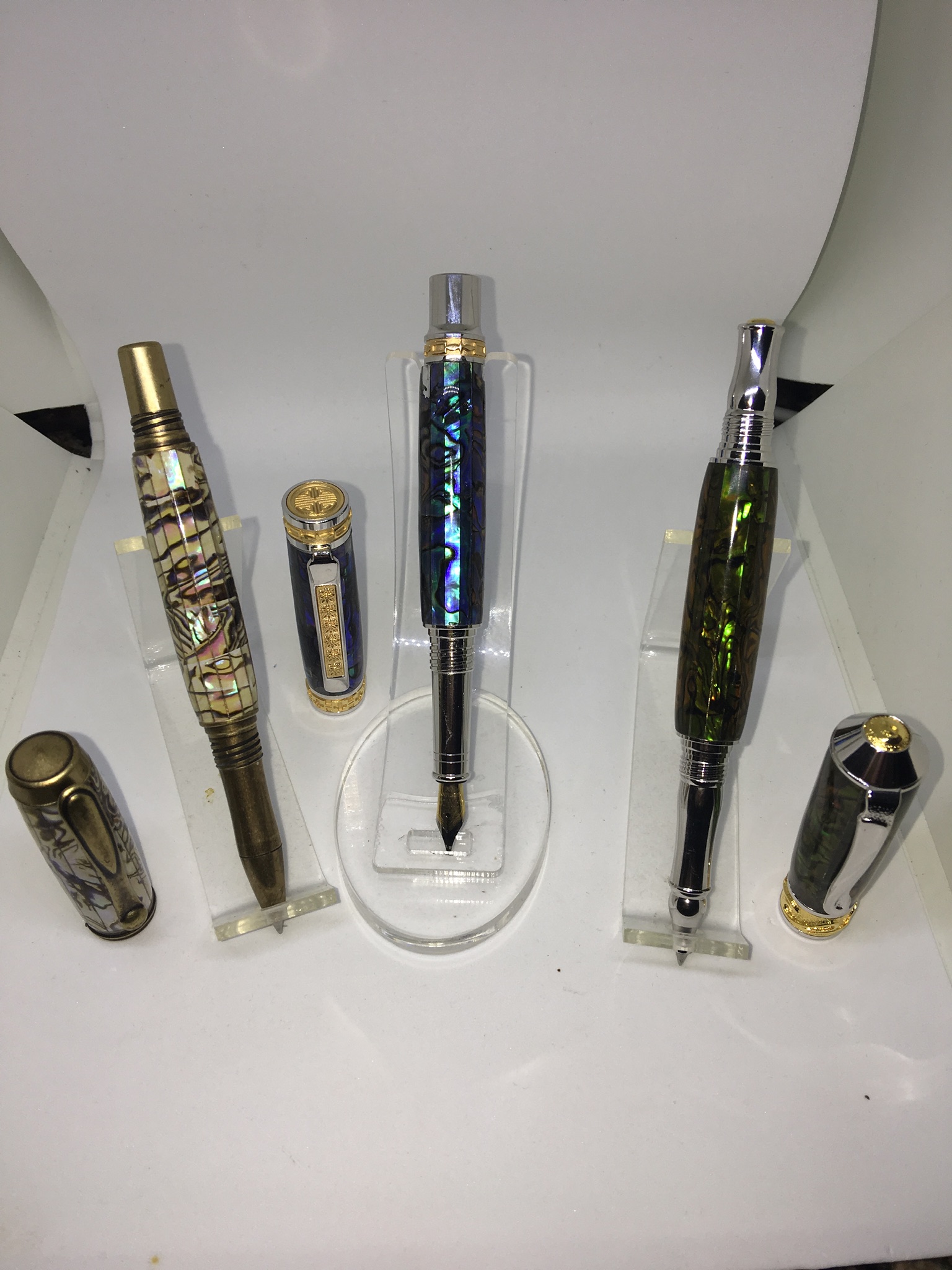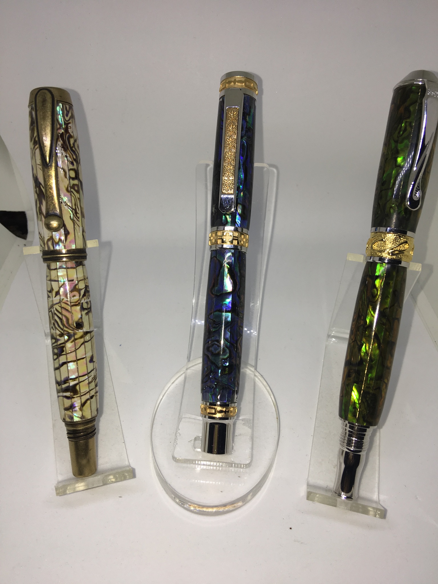 Three Paua Abalone pens I recently finished. A Jr. George in White Abalone, a Jr. Emperor in Blue and. Nouveau Sceptrein Green Gold. Many thanks to Jon David Jones for the Abalone. Apologies for the poor photos. A new photo tenth is in my future.
