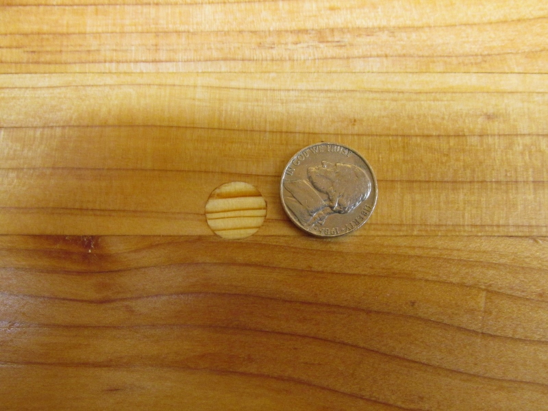 The round repair I dropped something heavy with a domed screw with a square drive. You could still see the imprint of it before I drilled the hole.