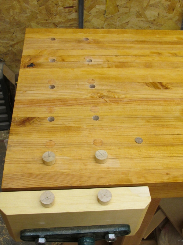 I had also had an idiot moment when I first built my bench. I measured the opening on my vice jaws and determined that 6 inches was a good spacing for my dog holes. I then went to my bench, hooked the tape on the front of the bench, measured back six inches and drilled the first set of holes, measured six more inches and drilled the next set, and so on and so on. Then I tried to clamp a 1 by 4. Doh!:redface: I've made due the last decade by putting shims in to hold things smaller than 6 inches. I figured I might as well fix it right. Filled all the old dog holes and drilled new ones that are 3 inches from the front. Had to redrill three of them. It's harder to drill a straight hole with a hand brace than it looks.