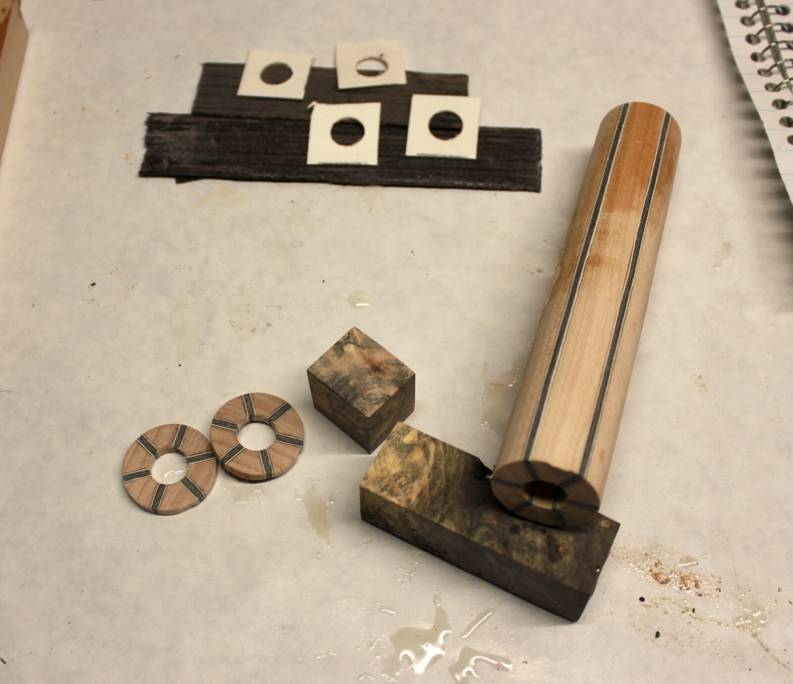 I made a new slotted billet with a grey inlay, so I needed some Buckeye burl. All I had were three small cutoffs that were in my scrap tub. One was barely long enough for the middle section, and two very short pieces of natural end cutoffs hopefully will complete the mission. The cap on the right has an inclusion clear through, so only about 1/4" is solid - I have no idea why I saved it, but it may work.