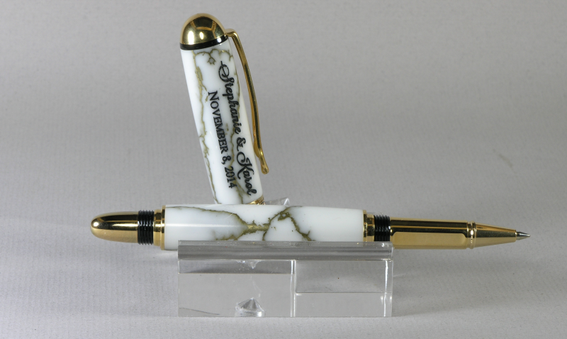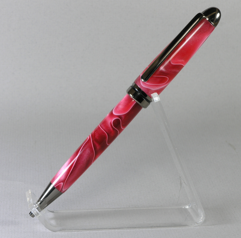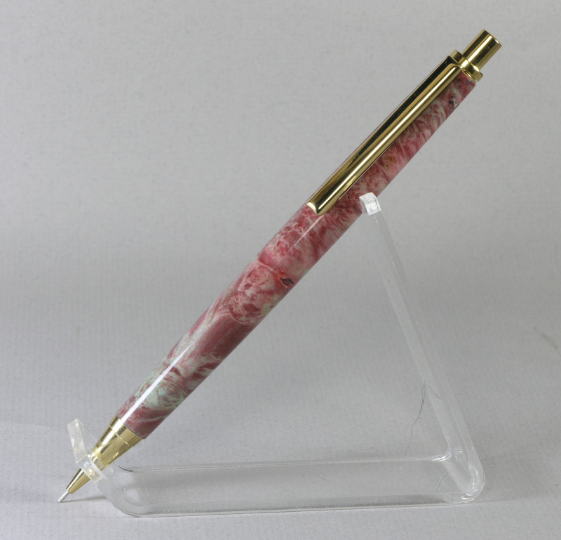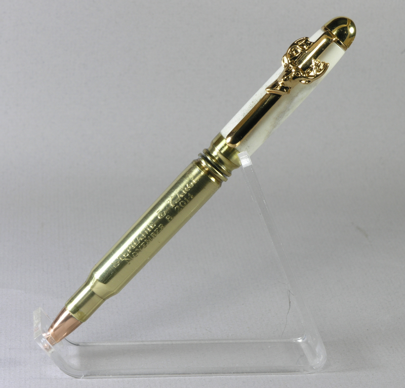The daughter of one of my wife's cousins is getting married in Nov. I was showing her the pens on my website so she could pick a style she liked for a wedding pen. When she saw the shell casing pens she had to have one, the picture of the top half of her invitation gives you an idea why. Her mother preferred the other so I made both. The 30 06 cartridge was engraved then dipped in wipe on poly 4 times. The Sedona is in white with gold matrix truestone. The other two are for my grandaughter who is heading back to school. A 7mm euro in gunmetal and an acrylic that was a freebee with one of my purchases. The pencil is box elder burl that was dyed red sanded lightly and dyed again with a blue/green. CA finish.