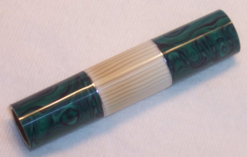 Trying to figure out where it all went wrong..... I'm planning on putting together a segmented blank for an Imperial kit and wanted to have a better idea of how it might look before starting, so tried to do a sierra in the same style using cut-offs from a malachite tru-stone pen and a Casein pen. You can see in the picture below the direction I'm trying to get- however you can also see how the casein section ended up being discolored, almost having a "toasted" look. The Casein Jr Emperor I made from which (whence?) this cut-off came did not exhibit any of the discoloration- and while I'm not sure, I think there may have been a little similar discoloration to the ejecta while drilling this blank, which I did on the lathe. When I drilled the blanks for the Jr Emperor, I'm sure they came out the same ivory color as the finished product, with no discoloration. I'm sure I was drilling at a higher speed on the lathe than I was on the Drill Press, and so am wondering if this may be from heat build up. Ed suggested another possibility may be that the casein (being porous) picked up contaminates during sanding, possibly from the aluminum strips- which could also account for why I didn't have any issues with the Jr Emperor, since it was single material blanks. At any rate, thought I'd see if there was anyone else wanting to suggest a cause for this effect, or if anyone else had experienced anything similar while working with casein? I'd hate to end up with the same effect on Imperial blanks if I/we can figure out what happened and what I can do to avoid a repeat.