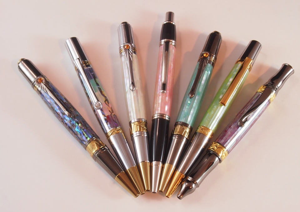 I did a hands own demo for the Richmond Penturners last night where everyone got to make their own abalone blank using strips. In leading up to the demo, I made several pens using Blue Paua and Mother of Pearl Strips and playing with various background colors. From left to Right; Blue Paua on a black background,
