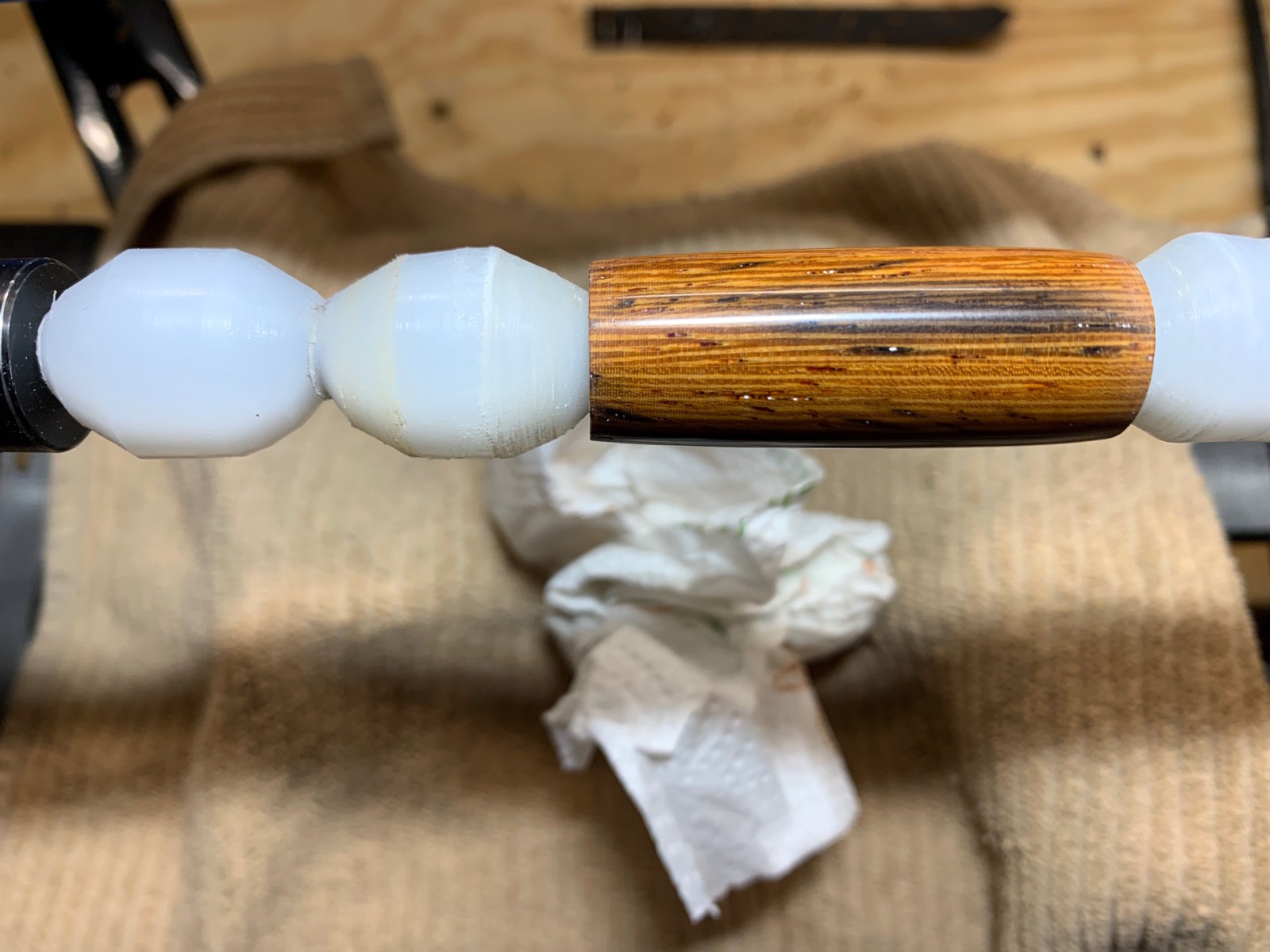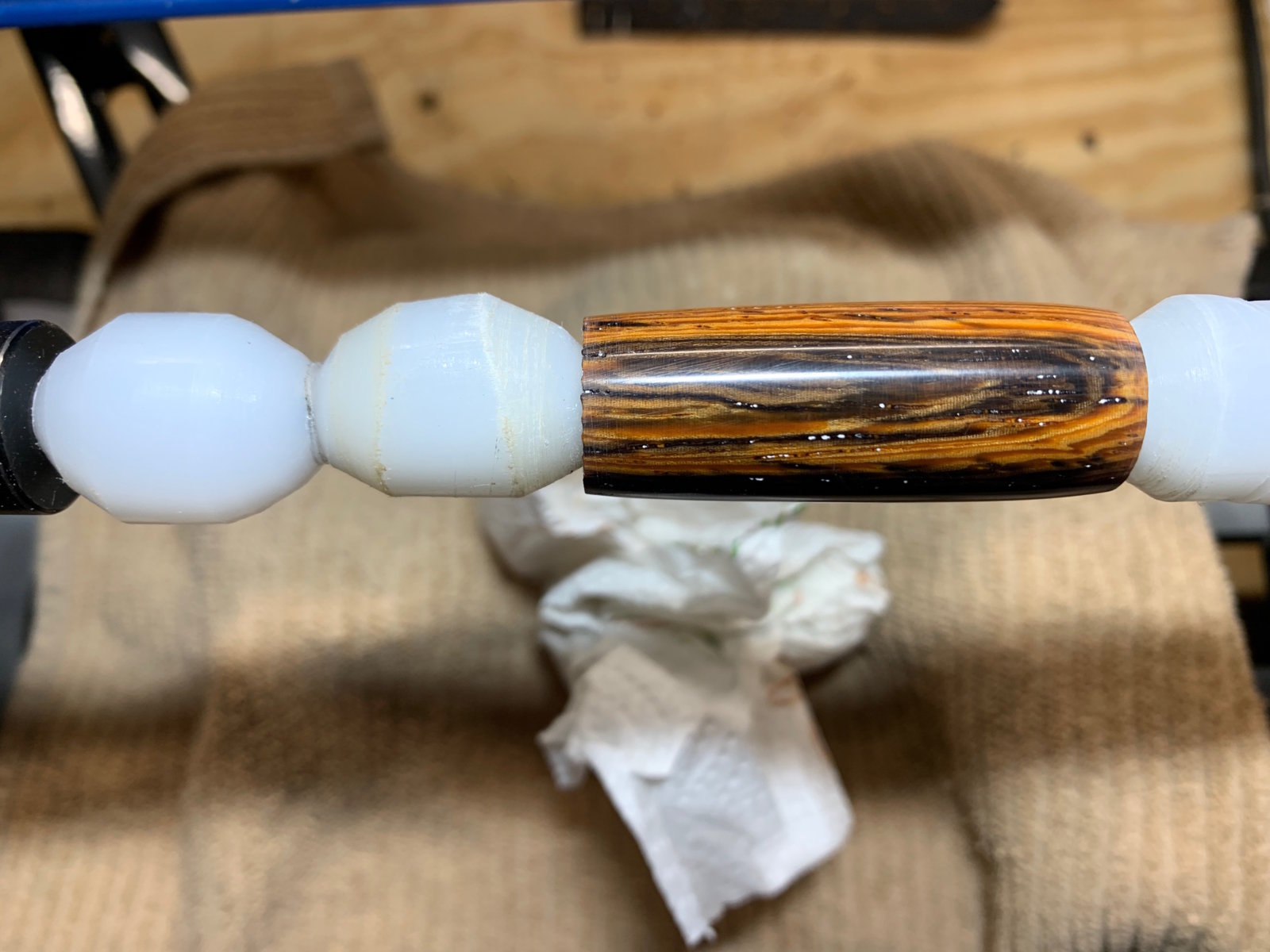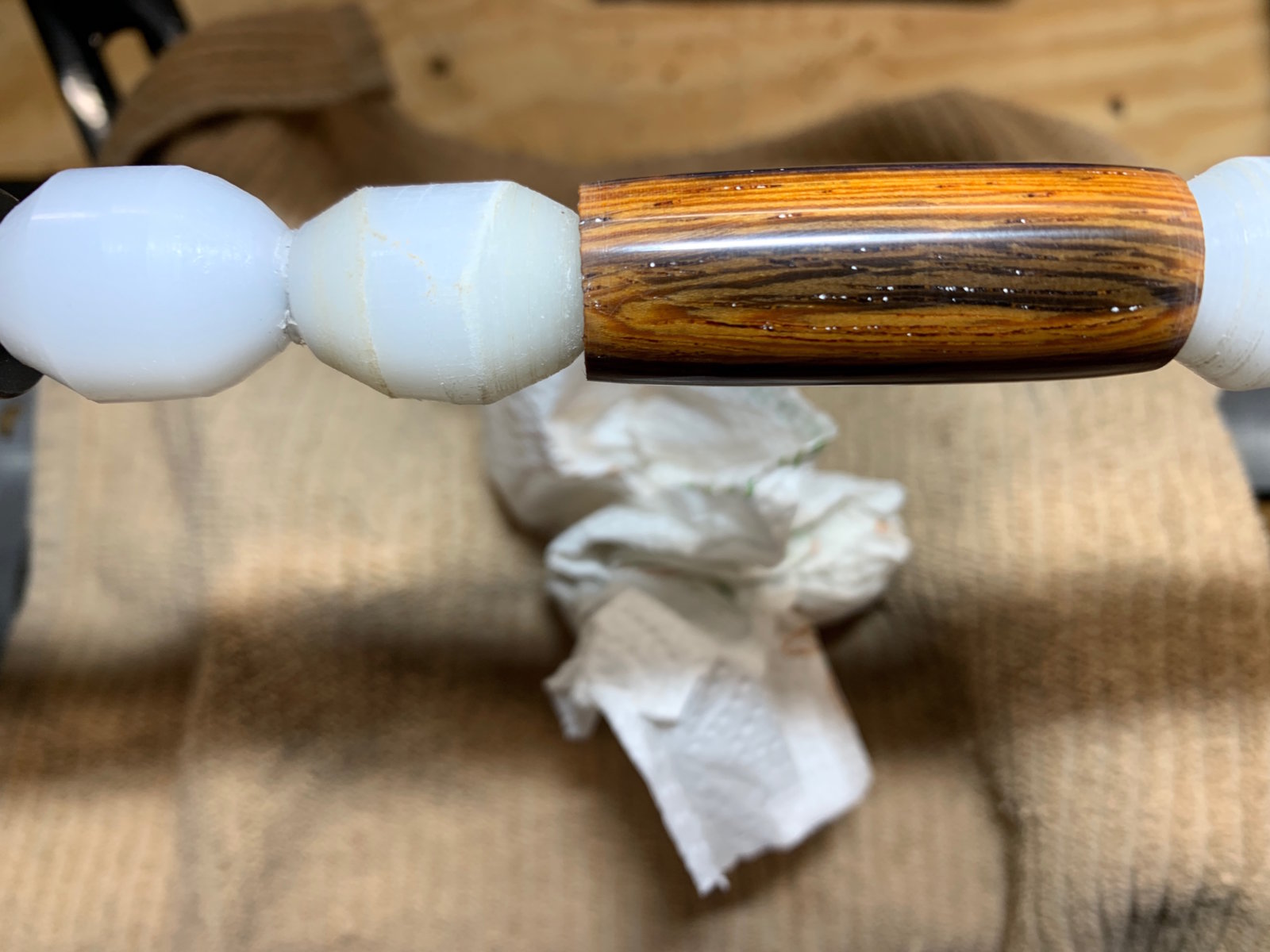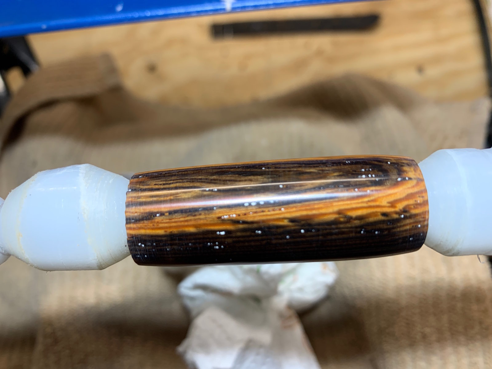 It's making me crazy. Get the blank to perfect sanded finish, smooth as glass, then try to apply CA and screw it up causing white embedded streaks. Here is what I've tried to do: