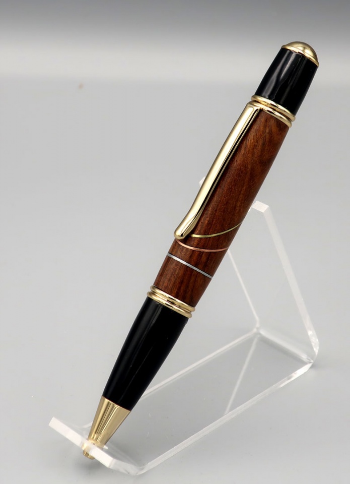 This is my first foray into segmented blanks. Not particularly pretty, but an experiment to see if clumsy old me could make semi-decent cuts using a 10" table saw with a 40-tooth combination blade. The blank is Walnut; the accents are Aluminum, Copper, and Brass at varied angles.
