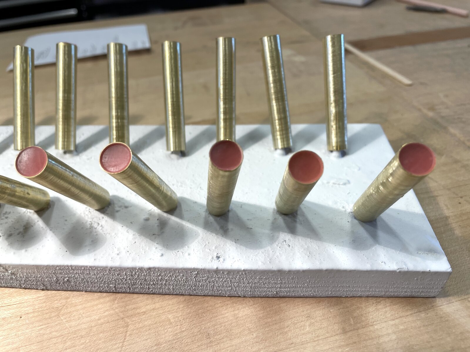 Second step is plugging one end of the tube. I use dental base wax available from EBay. Keep the white paper under the wax as you plug the ends. Last photo of this group shows all the tubes with the top end plugged ready for painting.