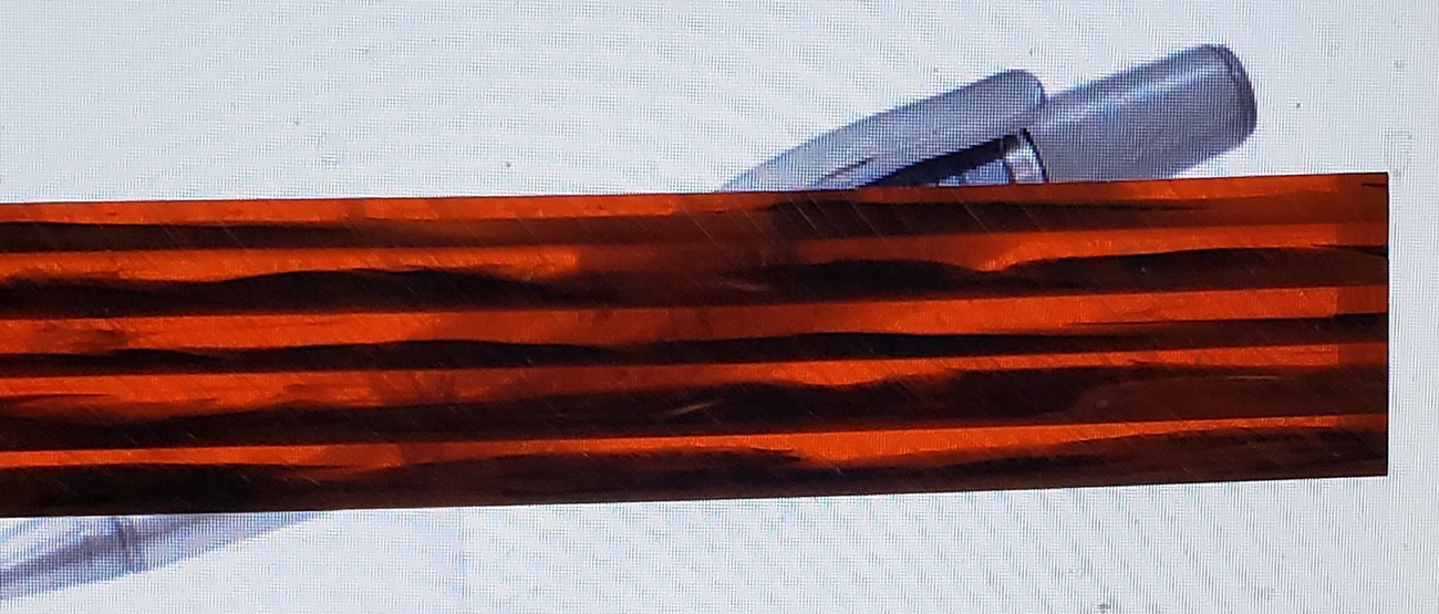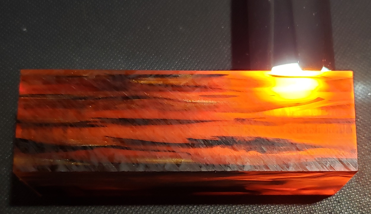 I would experiment. May want to try metallic blue. Here is an example. I had shown this when I made this pen set. I tried white and it washed it out(left) I tried a brown/red mix and it muddied the blank (bottom right side of blank) and settled on metallic blue which brought out the orange and highlighted the black (top right) I should have mentioned I tried black also but made the blank too dark and washed out the whites. Also mention I only back painted the blank and no need to paint tubes. I never do that. I will at time add some color to epoxy but not always. I did not in this case. All the Sierra pens I just shown were back painted with a color close to the blank color but that was because there were no veins running through them. View attachment 235663View attachment 235664