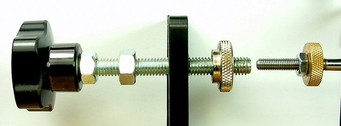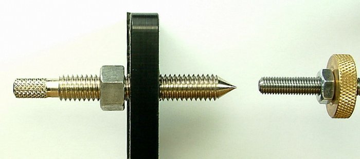 The pic of the existing method when you buy the Wizard I chucked in the bin ,Pic 2 shows a piece of threaded rod, drilled for a firm fit the size of the thread on the mandrel. I recessed a hole in the rod to act as a Mandrel Saver 3/8 recess. fitted a nut either side on the rod through the black upright, fitted a locknutted Knob on the outer end for quick setting up.