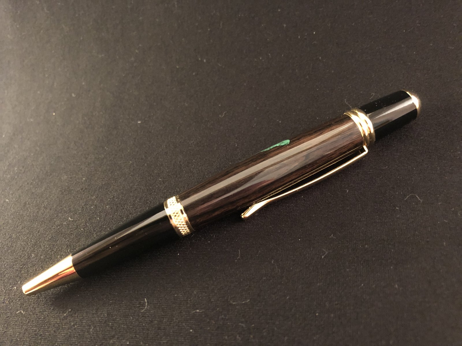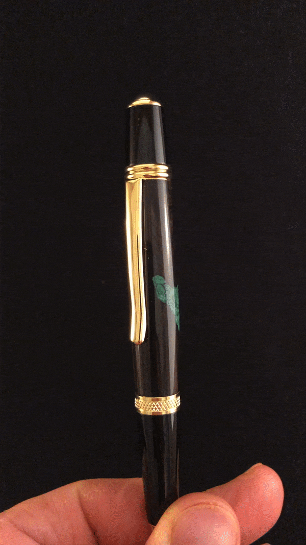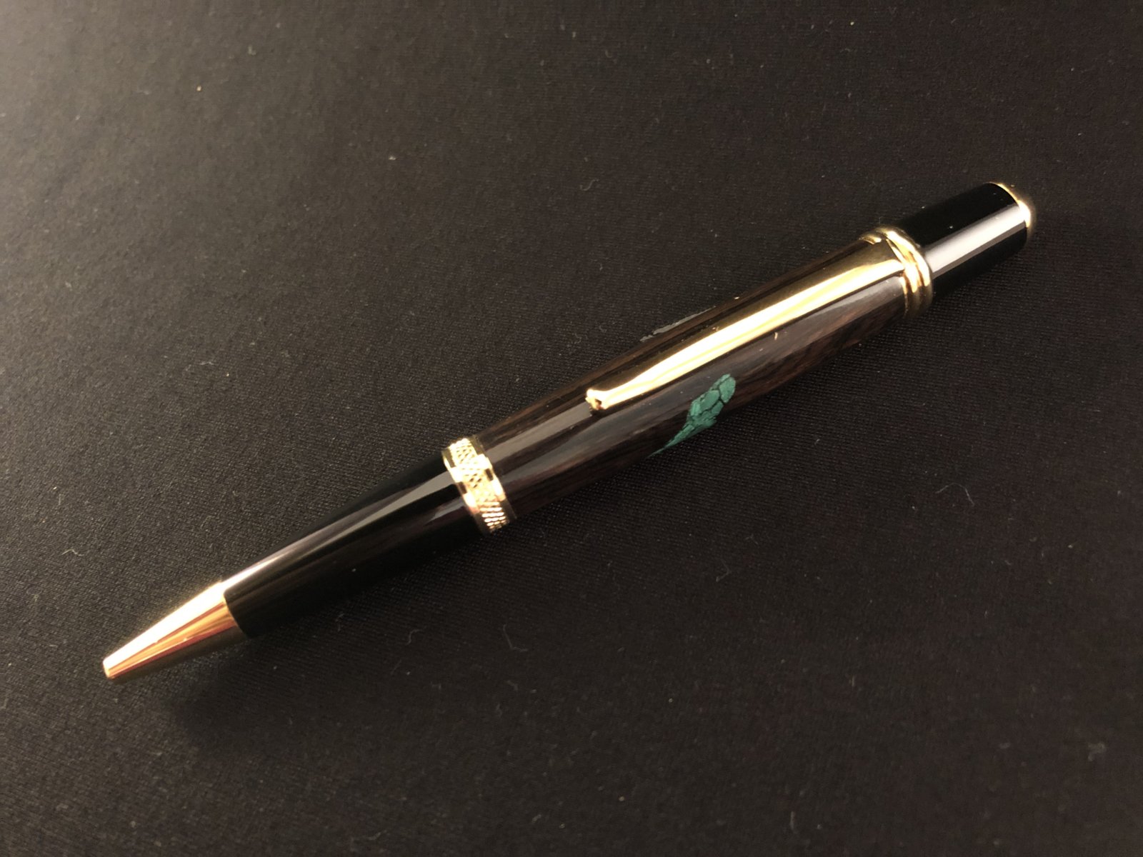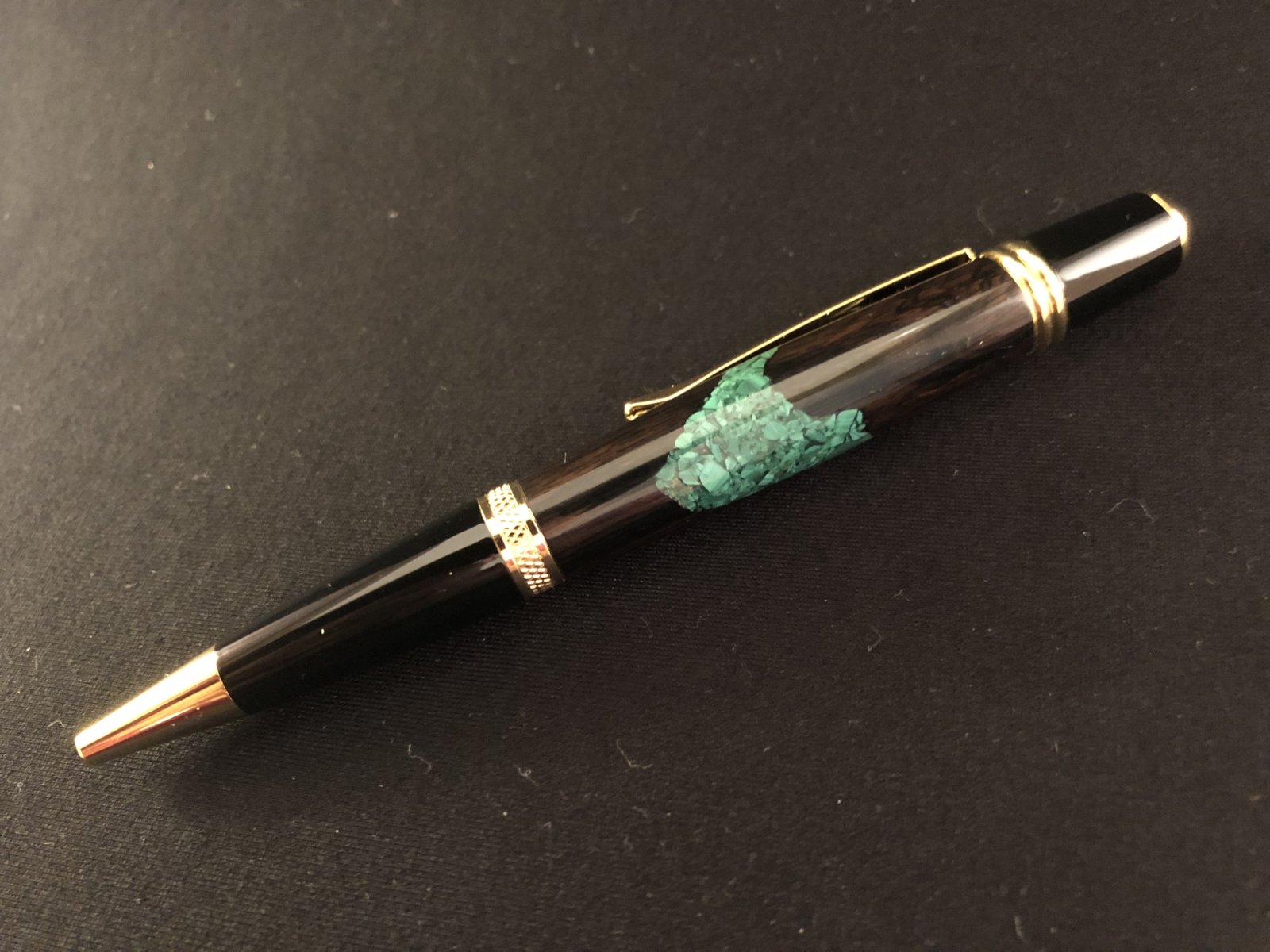 I want to do more of these. I've found that it's easier for me to turn the wood first, then cut out the design with a Dremel tool, then add the crushed stone with epoxy or CA. This is a Wall Street II pen kit with African blackwood and malachite inlay.