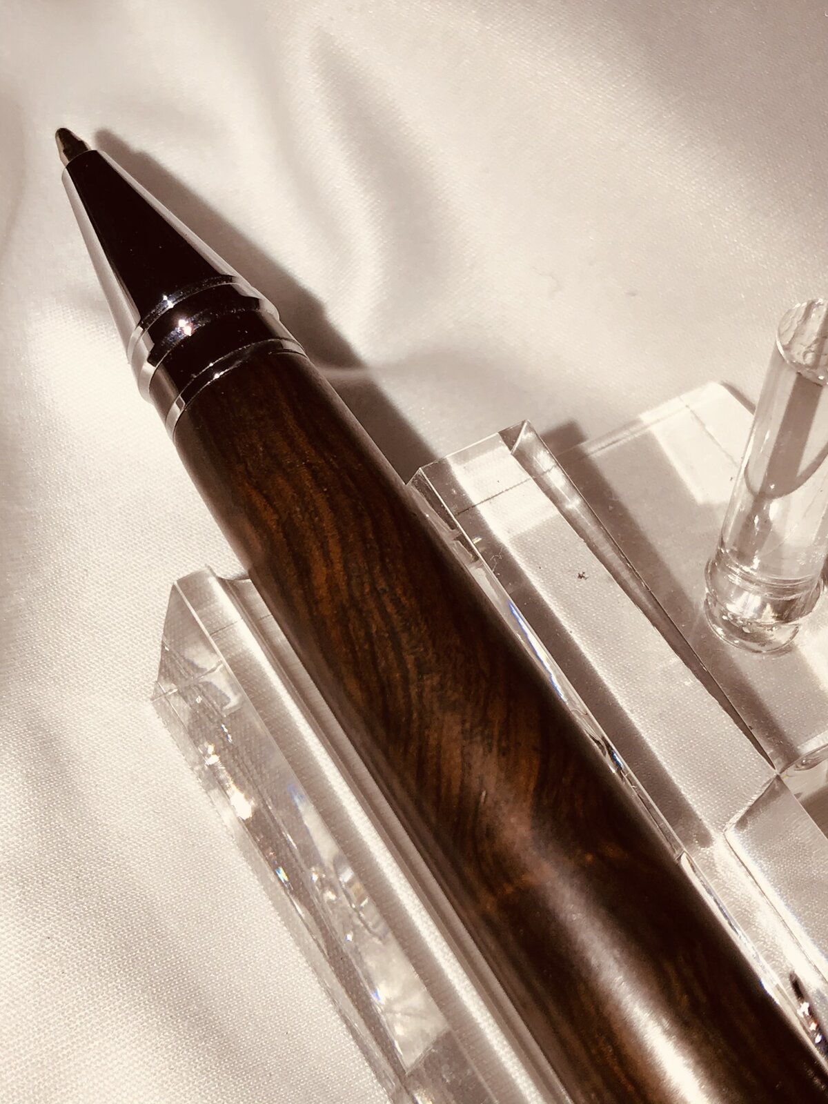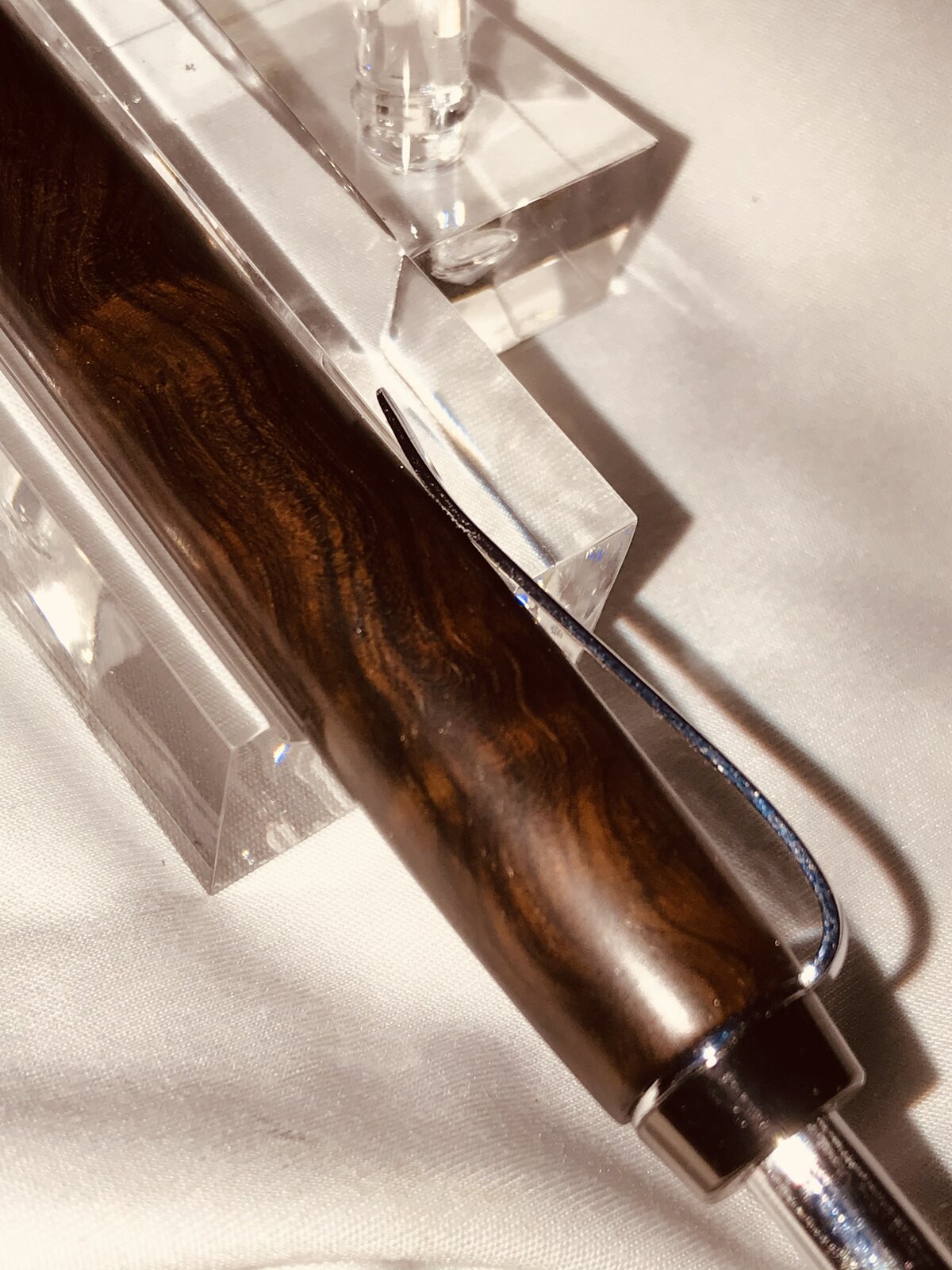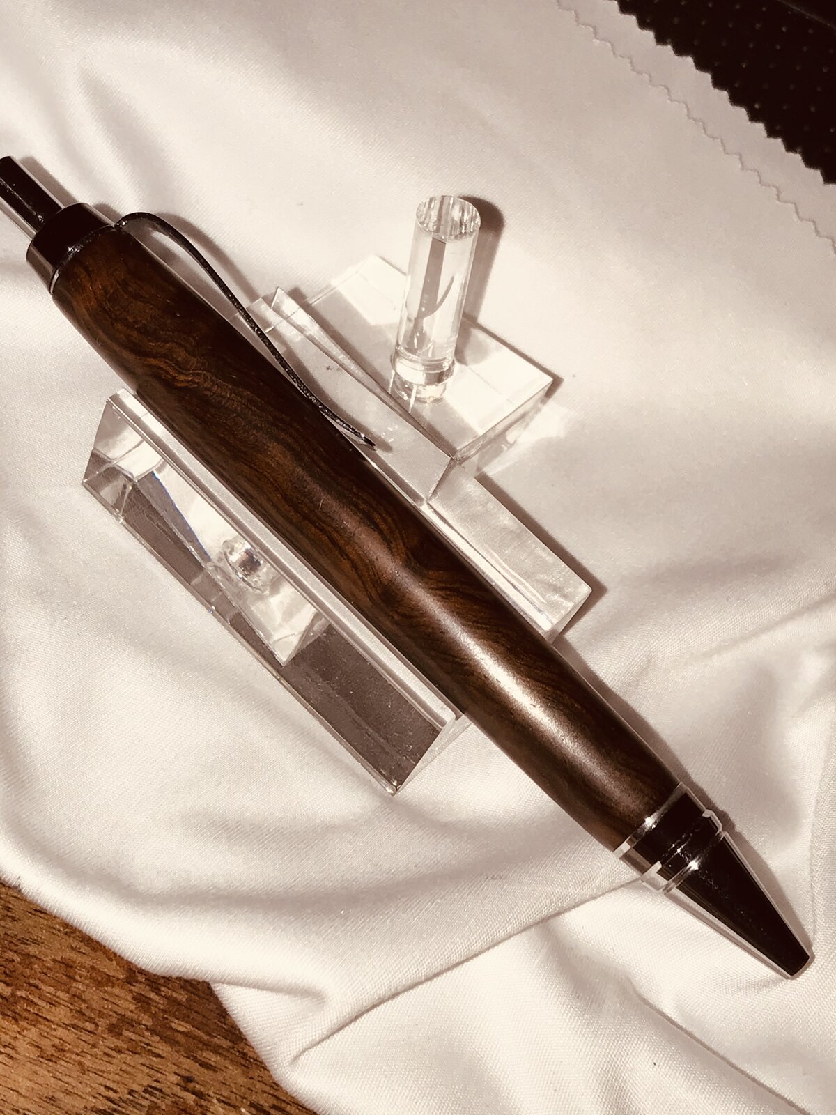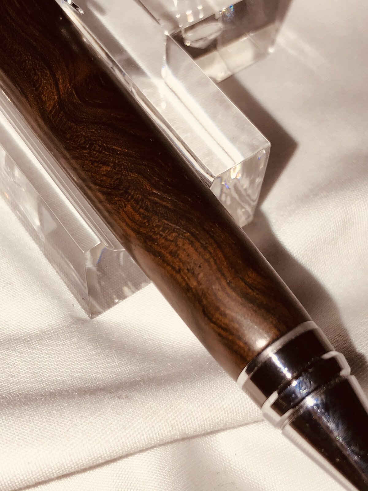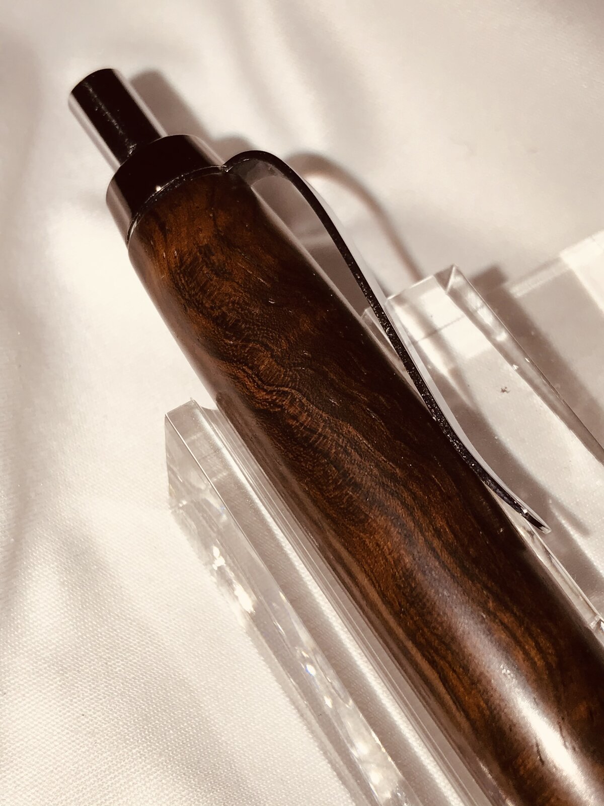 This is the same pen I showed yesterday in "Hommage to Mal" @magpens, after tweaking to compensate for the aforementioned, inadvertent, and yes rather stupid lack of accounting for the omission of the center band rings. It is now all "tweaked" up and ready for use, albeit not for sale. I took some closer photos to show the nice swirls of grain in the African Rosewood.