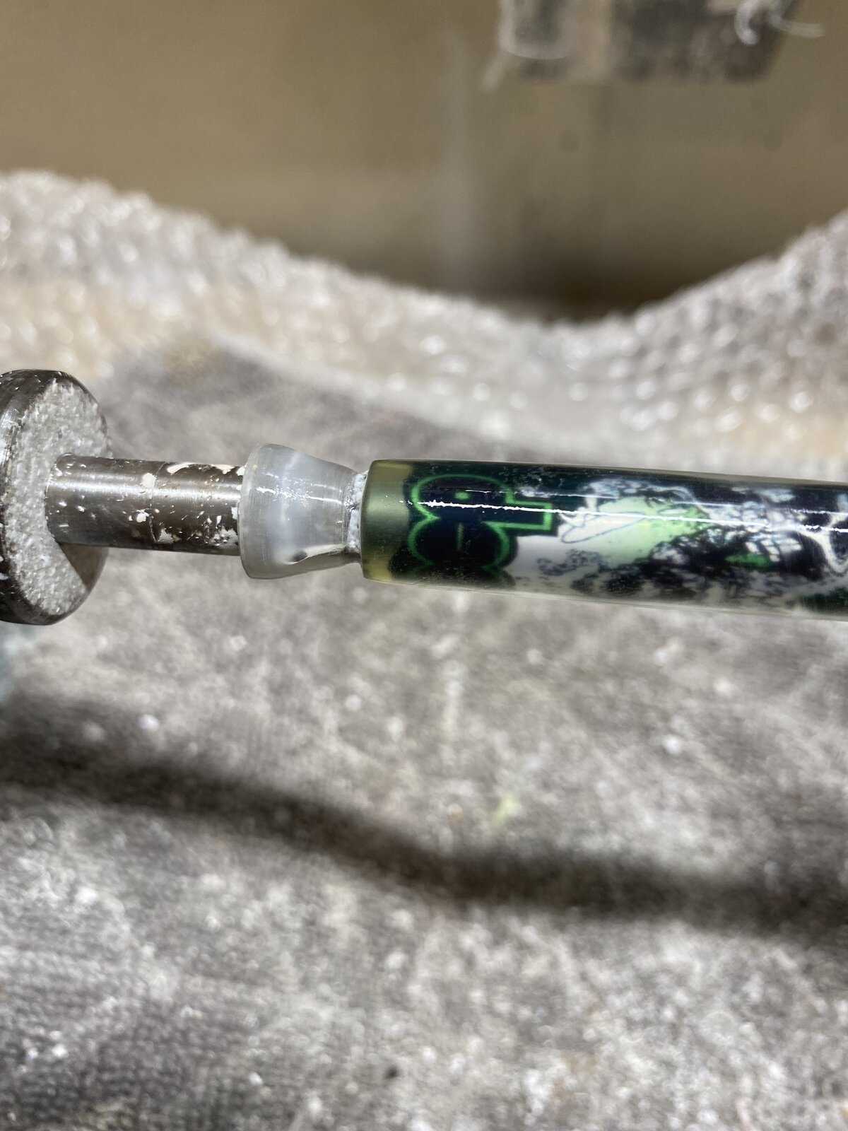 Casting labels with alumilite. I've done mostly Sierra tubes and this happened occasionally, now that I've started casting labels in slimline it seems to happen constantly. After casting everything looks fine. After I round the blank out on the lathe and get ready to sand these gaps/discolorations appear.