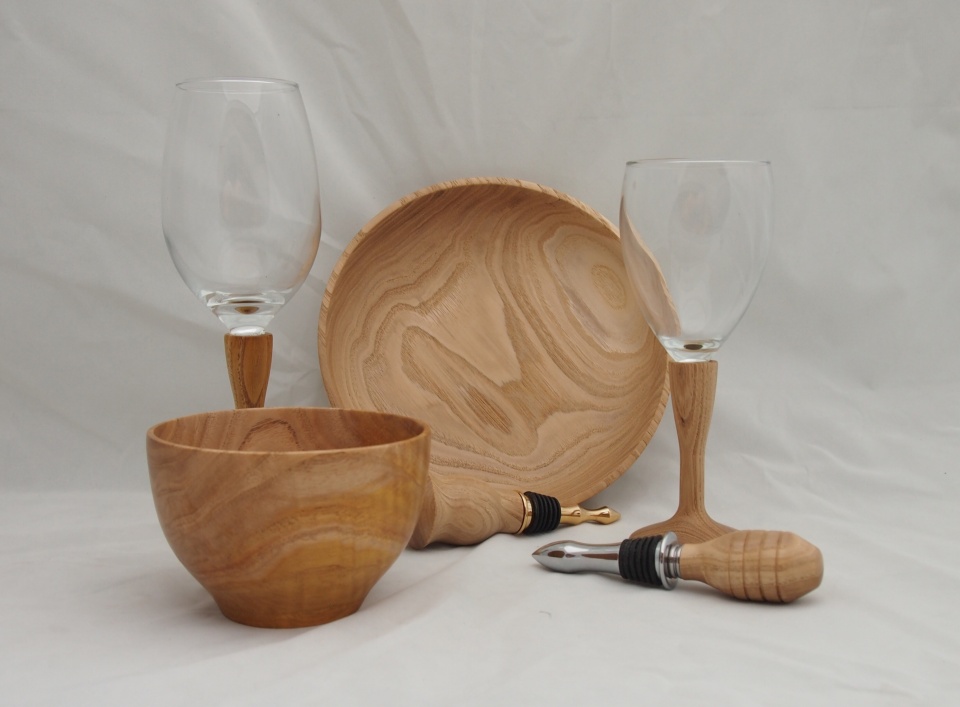 My uncle had a chinese chestnut taken down in his yard. It had been planted by his mother-in-law. My aunt requested that I make some bowls, bottle stoppers, and wine glasses for my cousins. It was a large order and has taken me sometime to complete. Here is a sampling of the stuff.