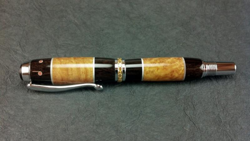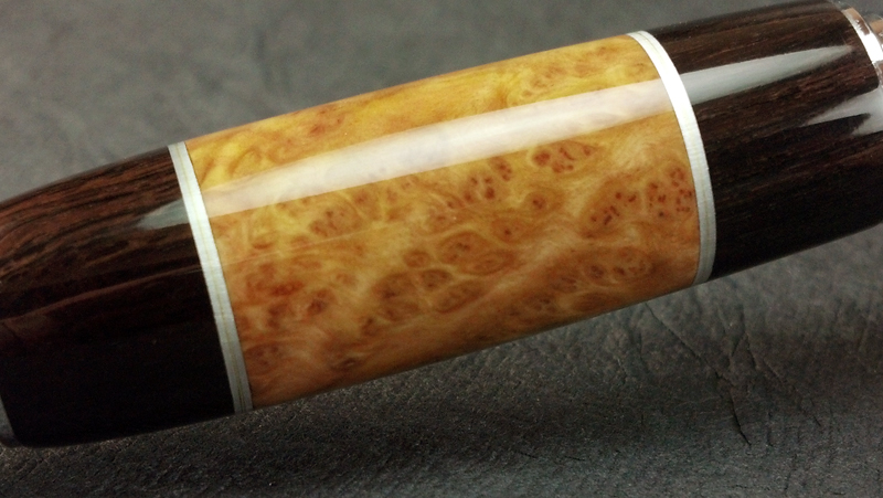Segmented with brass and aluminum. The wood is African Blackwood and Brown Mallee Burl. The dots are aluminum tubes with brass in the middle of the tube. The finial is African Blackwood with matching aluminum/brass dot. The aluminum segment has a thin sheet of brass sandwiched between the aluminum. The brass was quite thin and ends up being hard to see (see close up). This pen took a lot of time but was fun. Thanks for looking. Mike