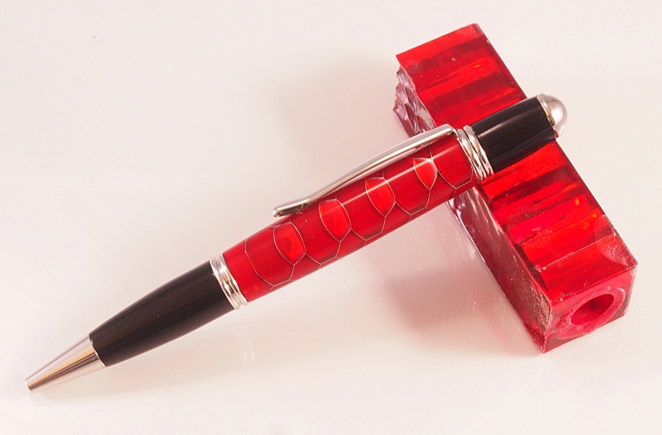 After seeing some of the honeycomb pens I decided to give it a try and got some aluminum honeycomb. I first tried it by pressure casting PR and blew out one of the cells when turning it. I then tried alumilite and was able to get this pen turned. It has one issue where a cell blew out on the end that I was able to hide under the clip. I think that I can reduce the possibility of that type of blow out by trying to line up the cells with the end of the tubes so that there is more meat in the cells. I back painted the blank red but think it would be have better painted white or silver.