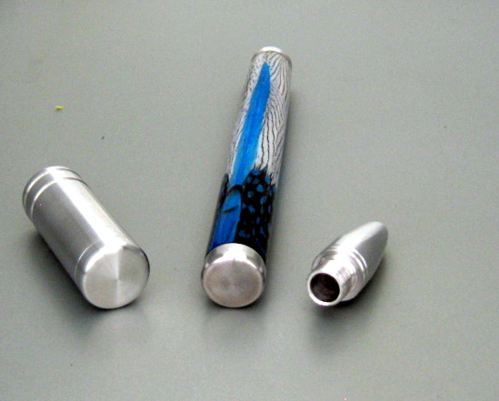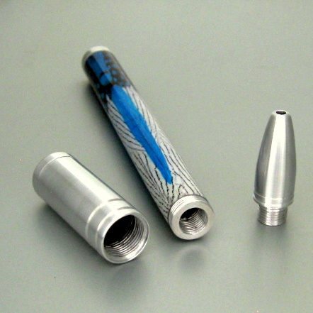 Got another feather blank from Cricket (Marla) This is a Longwood blank. I was hoping this one would have enough PR around the feathers to thread the body with the 12 mm triple start thread die, onto the body. It didn't. So I made an adapter again(same as the last one). The tube diameter is too large for the die to cut threads without risking damage to the blank. It worked out. Thanks for looking!