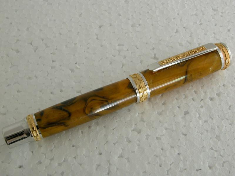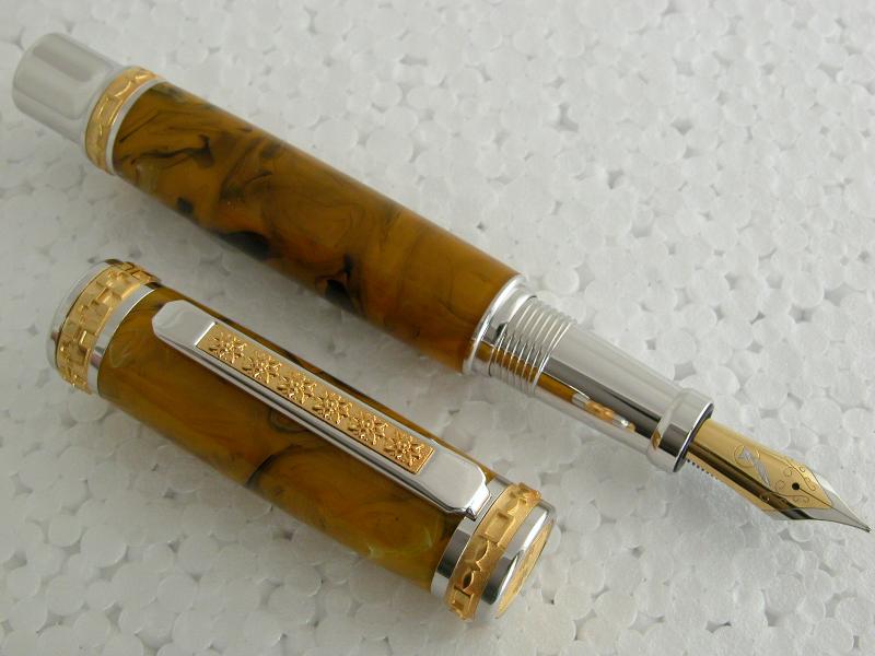 Here is another of the new old stock bakelite colors I am trying out on an full size Emperor fountain pen with one of Lous nibs. This one is amber color with a smokey black swirl. Is a translucent blank with depth, hard to see in photo.