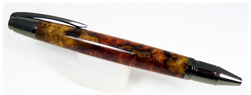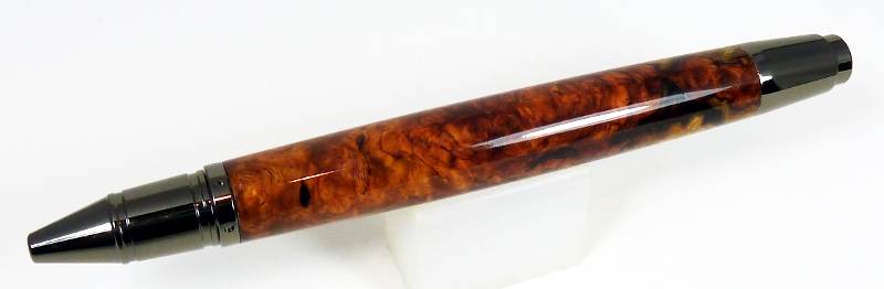 Have had this stick of Amboyna Burl for some time waiting for the right kit. Woodcraft started carrying the Accord Pen about 2 months ago or so and I liked it due to the 3 1/2" blank size...bought the Gunmetal version and turned the Amboyna for it. CA finish, MM to 12,000, Polished with PlastX. I really like this kit as it's fairly simple, but has good lines and balance. But most importantly is that it really shows off the blank that you place in it. Comments welcome.--Rich