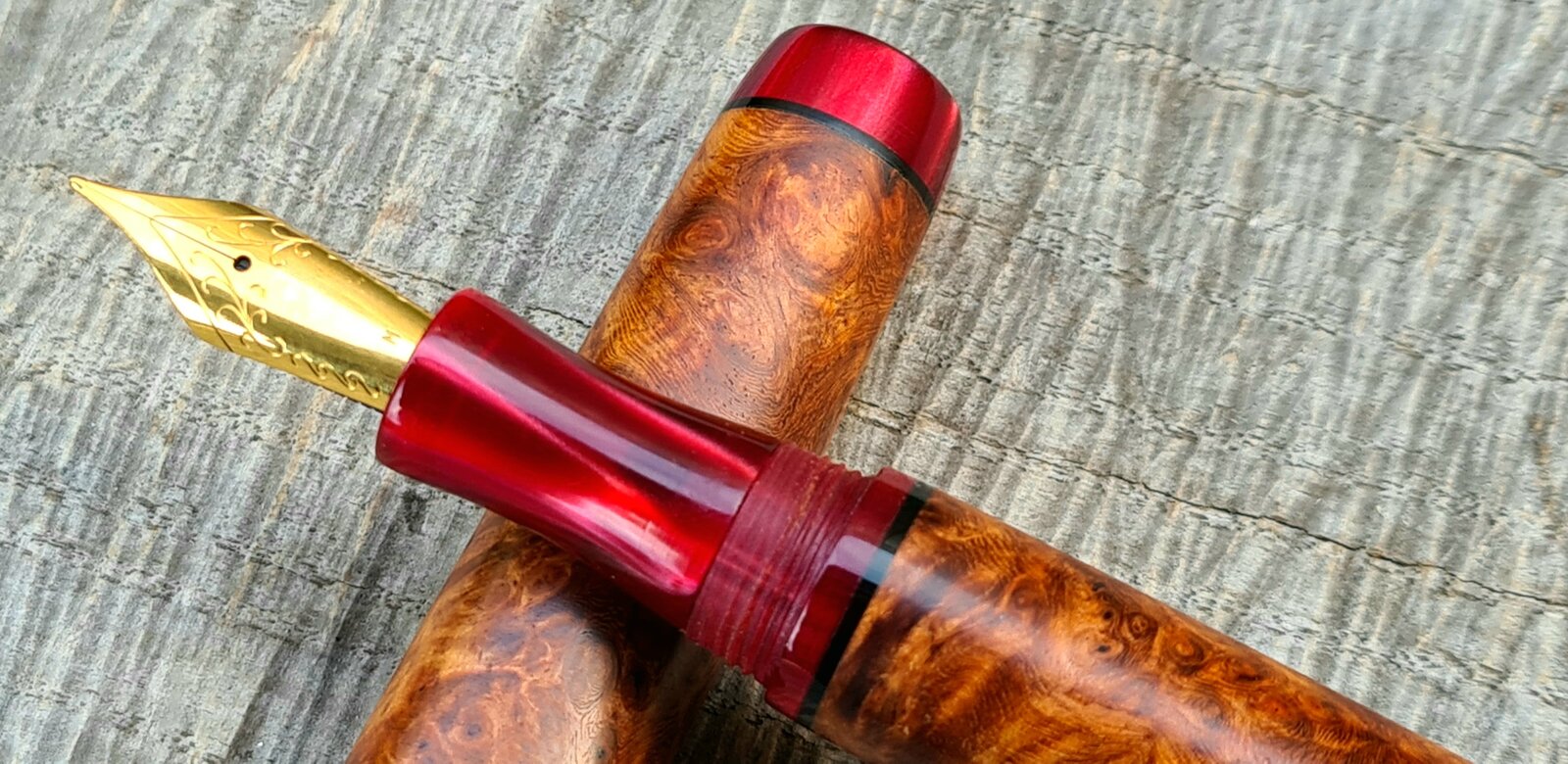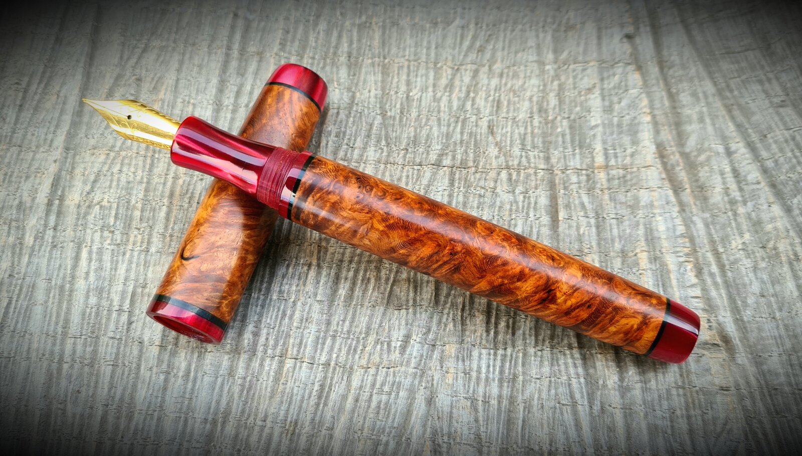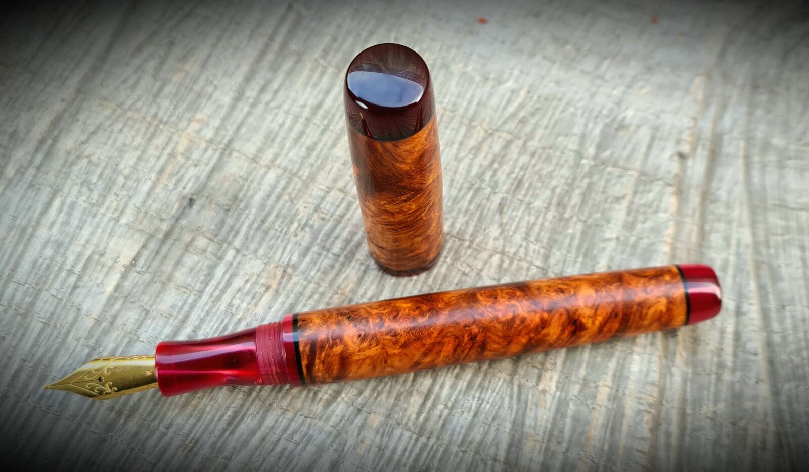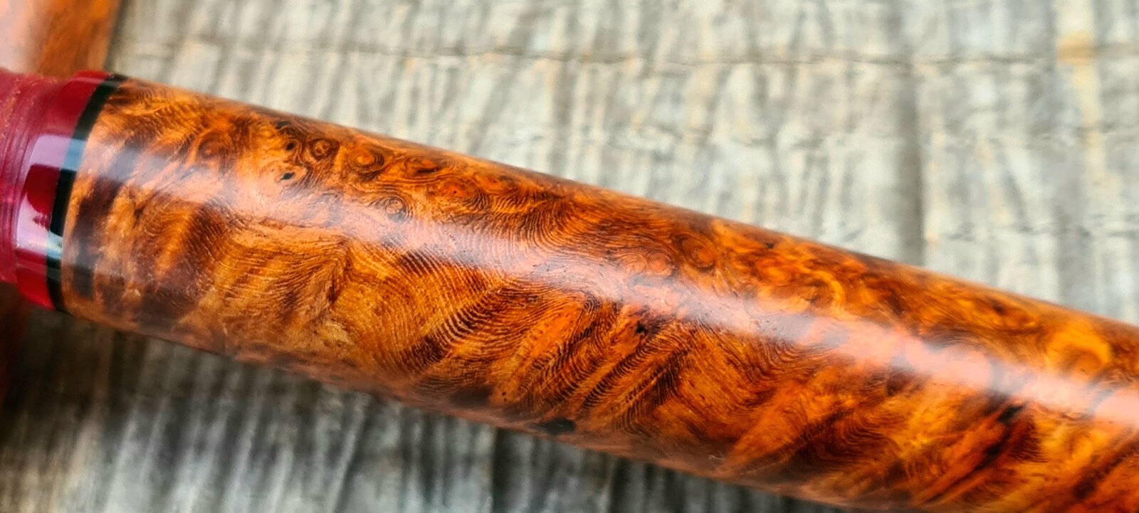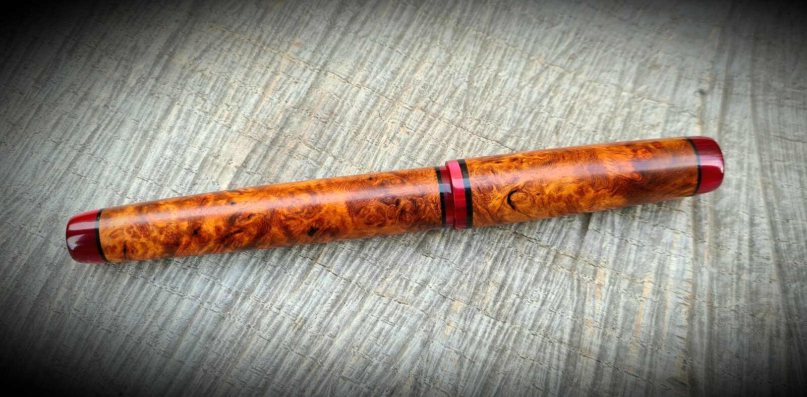 Got excited last night and posted indoor crappy pics of my pen. These are a bit better, now you can see the true colour of it. I absolutely loved making this. Stabilised amboyna burl, kirinite rioja pearl finials, section and sleeves, black acrylic spacers, natural finish, jowo #6 nib