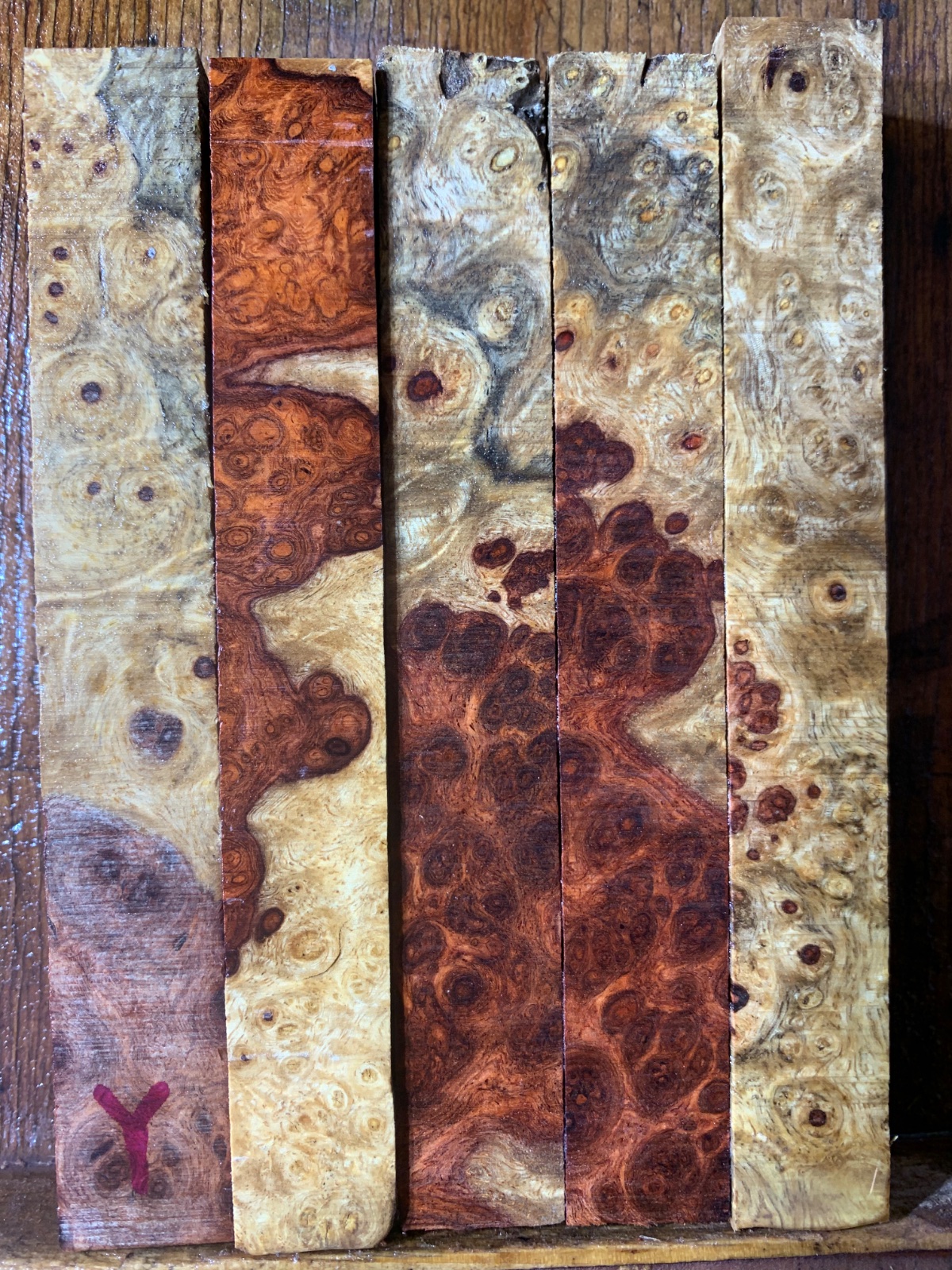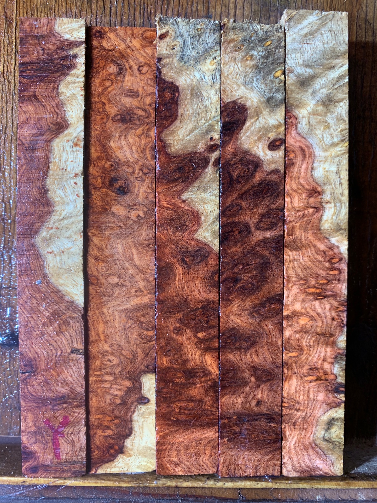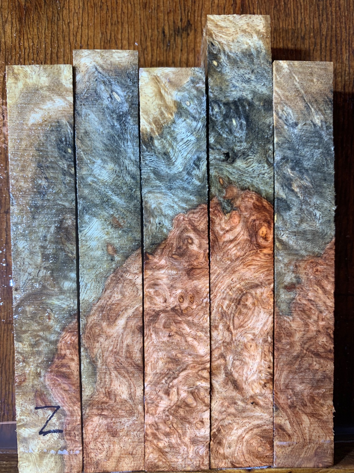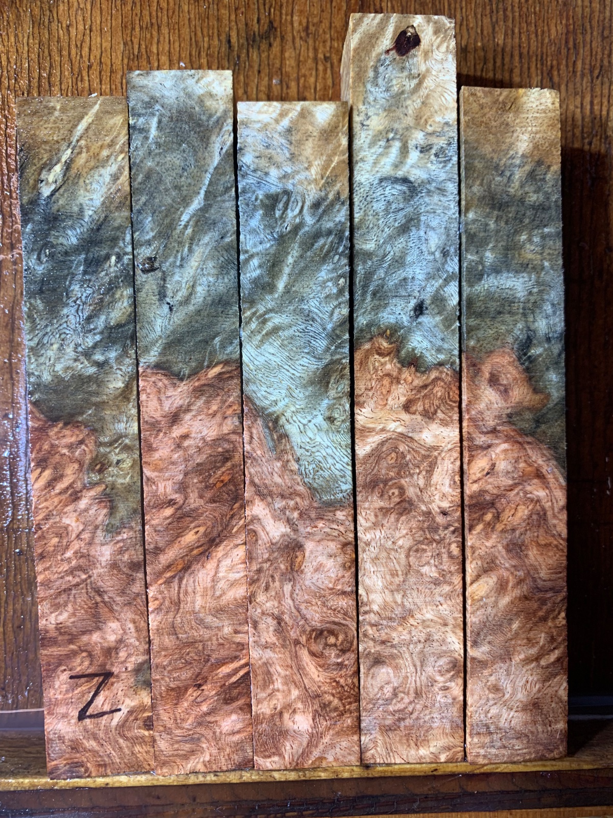 Two groups of two tone amboyna burl. I find pens made from two tone blanks are my best sellers. These have been dry over ten years. Roughly 3/4 x5 some are a couple hundredths of an inch less than 3/4. This is burl from Thailand so it is about 40% denser than amboyna from Indonesia. The group with the rare blue spalt is $50 and the other two-tone group is $45. Buy both groups and I will ship for free.
