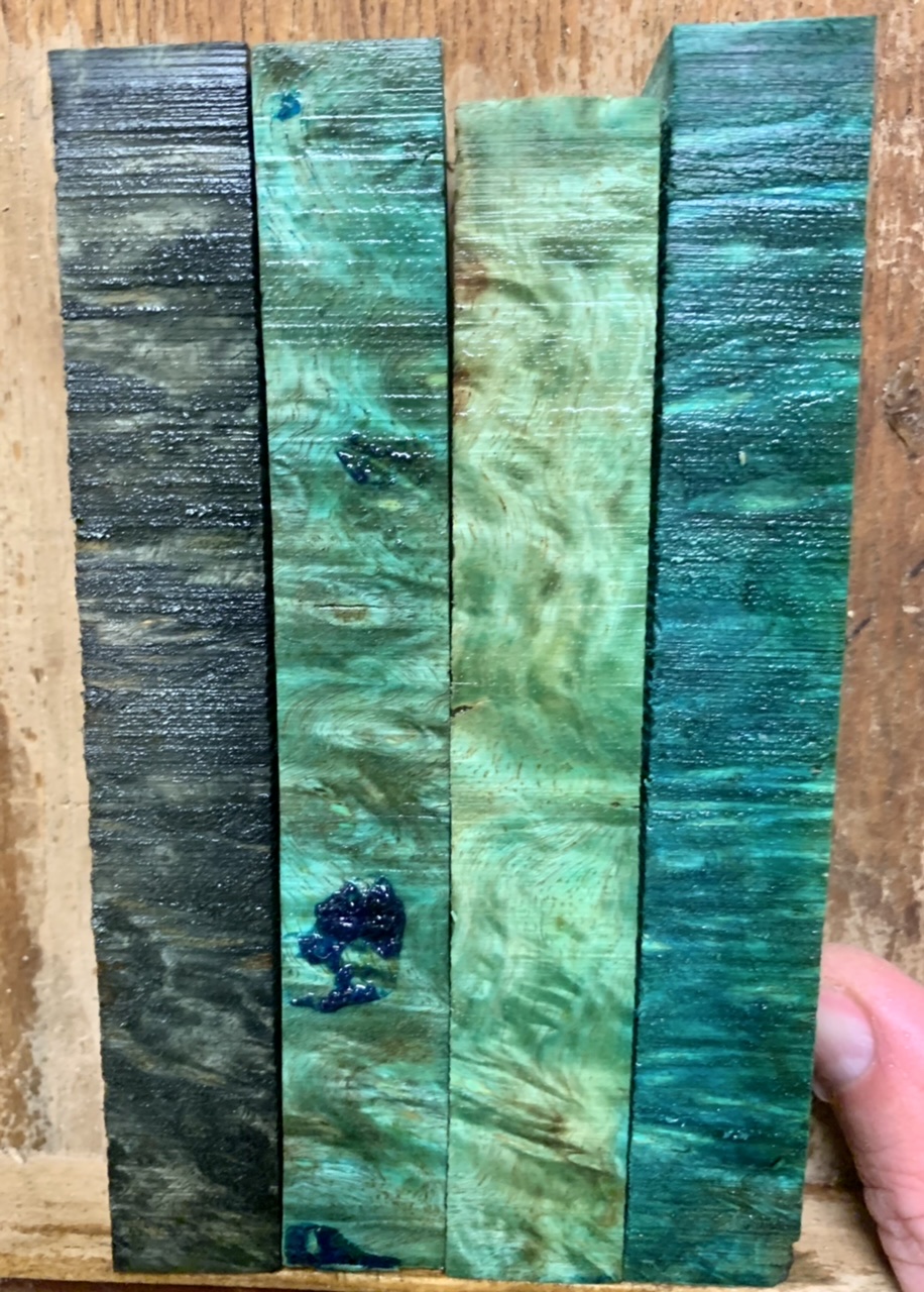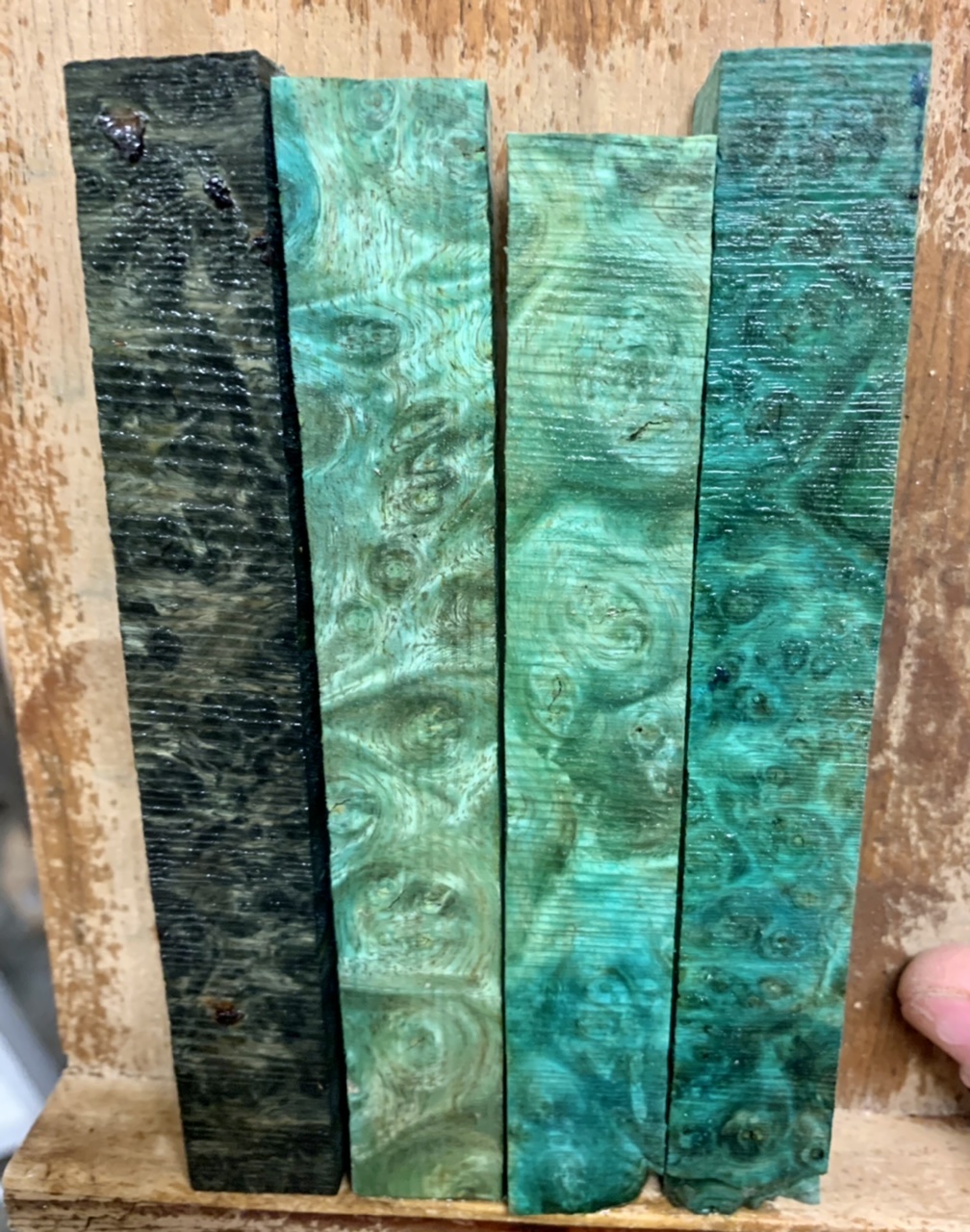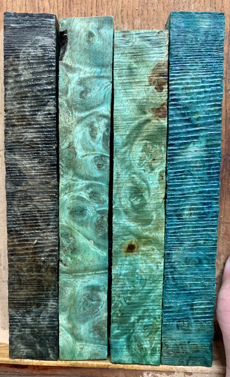 4 dyed teal/green stabilized amboyna burl sapwood blanks. 3/4 x 5. $20 plus shipping