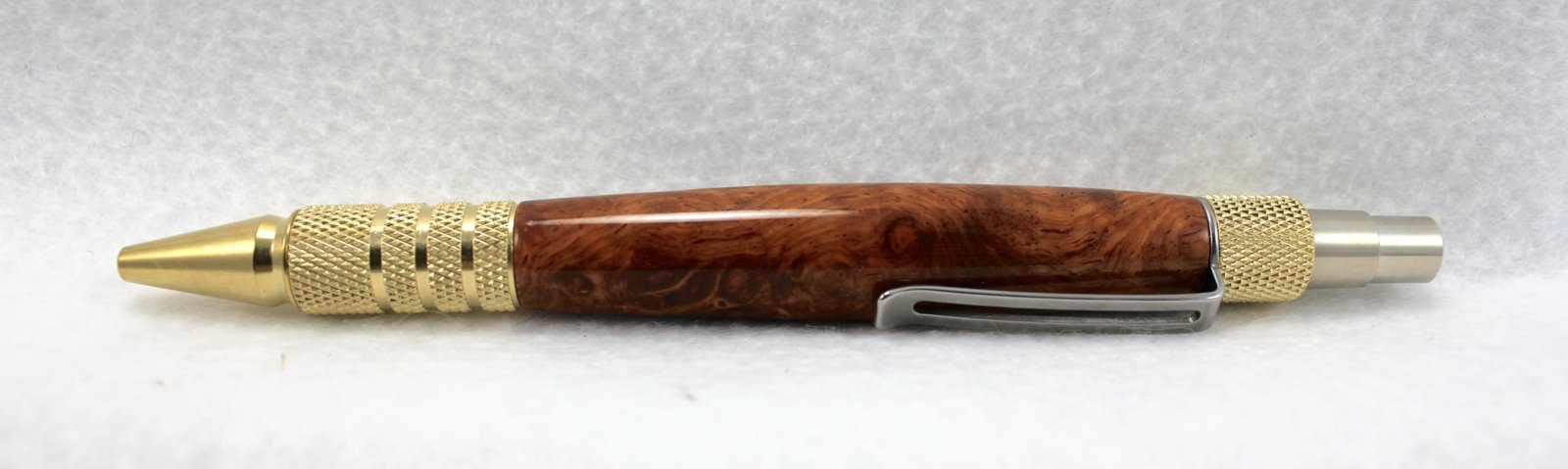 My brother asked for 10-15 of the EDC pens for his slaves at work. I ordered some 5 colored sets (Exotic Blanks), so there will be an opportunity to match the blanks with the platings. This is an Amboyna blank with the Brass kit. I wish the clip and top button were also Brass, but it's still a nice combo.