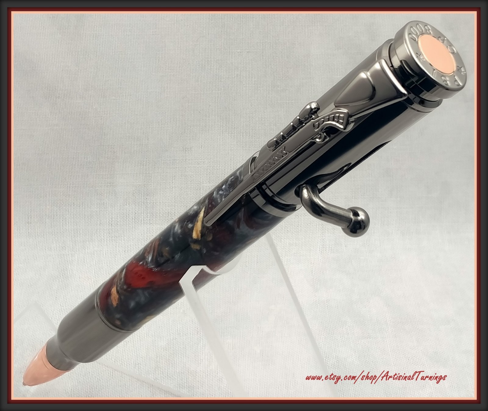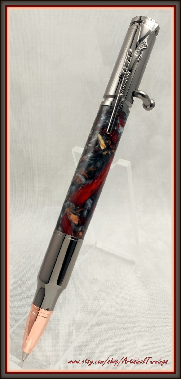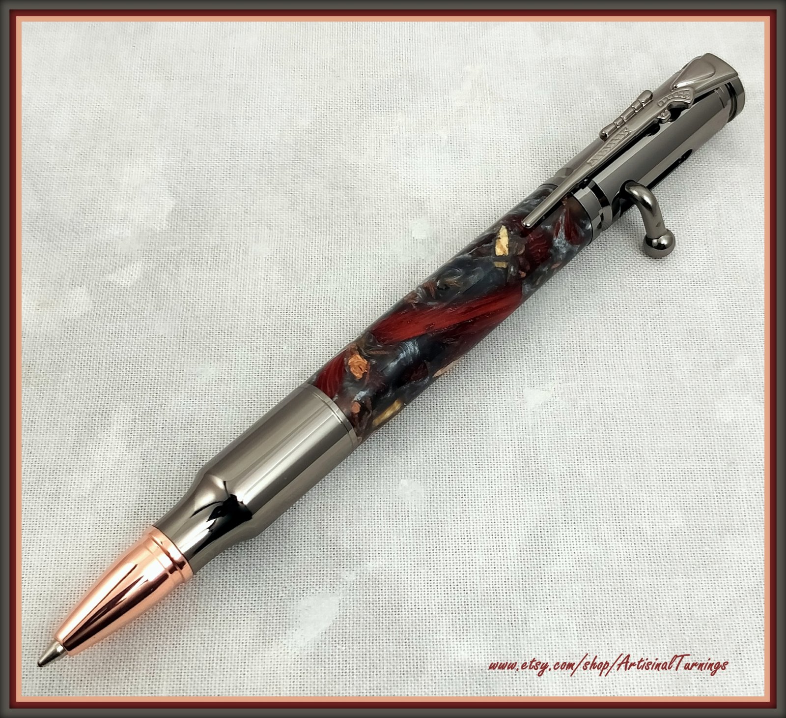 I thought this a pretty pairing. Crushed amboyna, scarlet and silver hybrid on a gun metal bolt action pen.