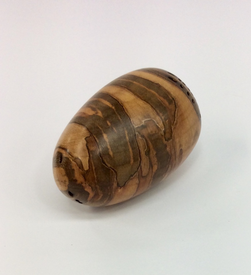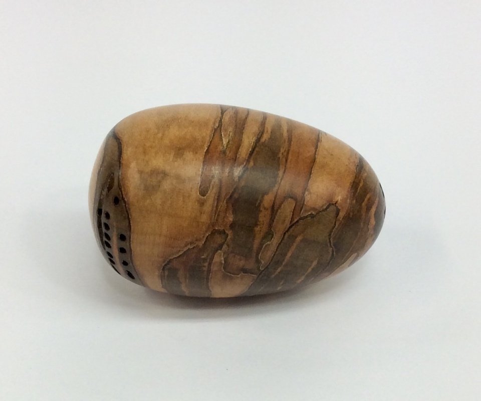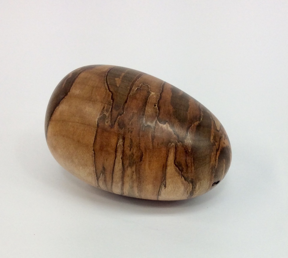 I have been turning eggs and spheres for several years. They are quick turns for craft shows while folks are observing. Anyway, here is an egg from last week. It is a piece of cross grain ambrosia maple complete with holes. It has a couple of coats of Tung Oil Finish and was buffed.