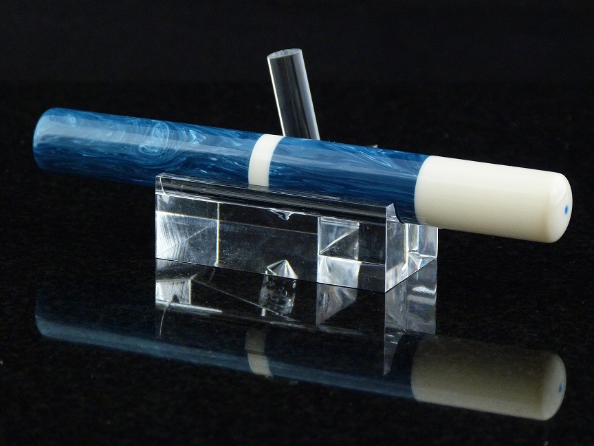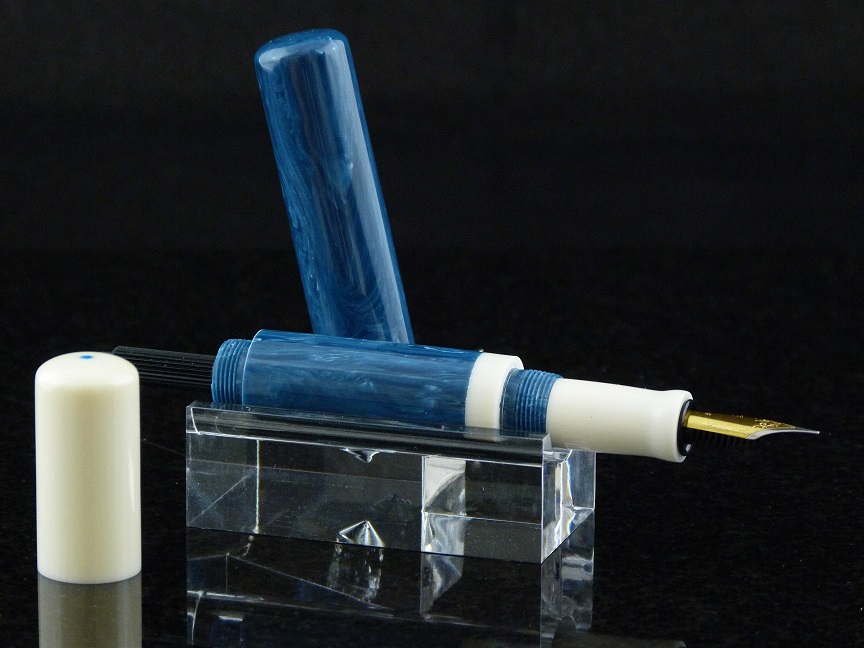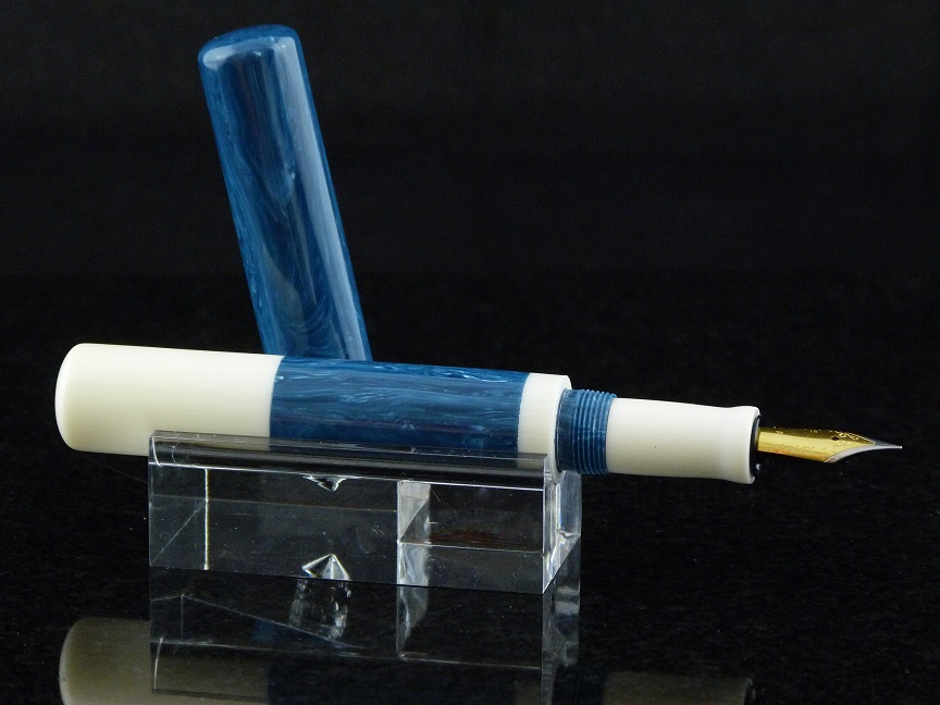 Just finished up another componentless pen. This one isturned from amedeo blue acrylic resin and alternate ivory blanks from Exotics.Nib is a #5 from Meister Nibs. Body/section thread 9 x.75, cap and "fill cap", ifthat's what it's called, is 12 x .75. I did not utilize the theory of "measure twice,cut (drill) once", and ended up drilling through the end of the body. My savewas to thread and create the fill cap, although it did prevent me from turning the body downto a more typical diameter. I think it turned out ok though. This one will bemy daily pen on my desk at work. Not at the point where I feel comfortable tryingto sell a componentless pen yet. But from what I read, most of you who sell kitpens and componentless pens side by side, say customers prefer the kit pensmore. Anyways, Comments welcome. Having alot of enjoyment working my way through the custom pen scene.
