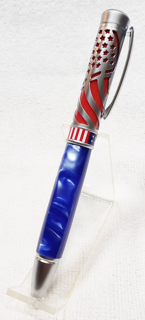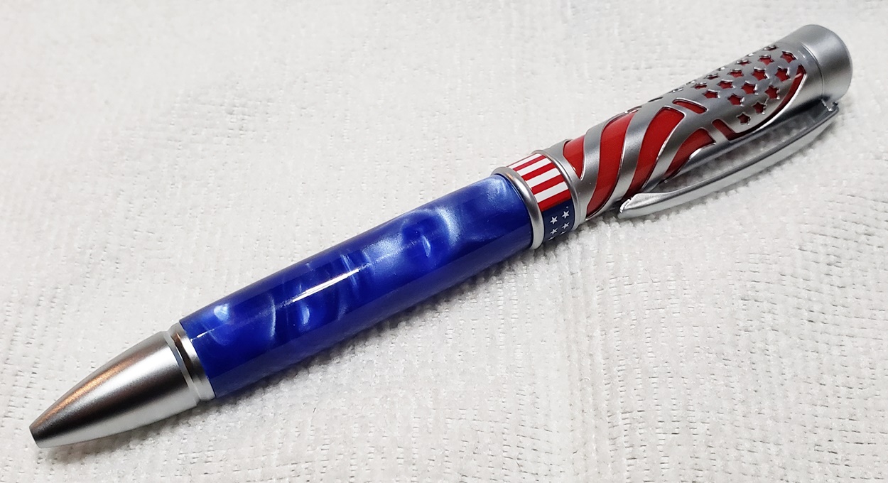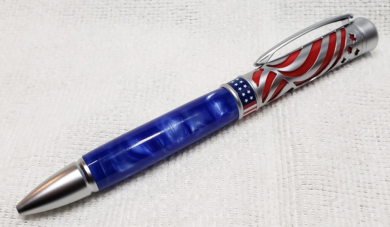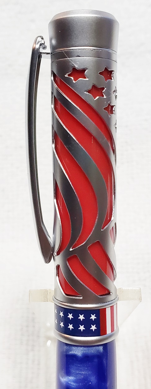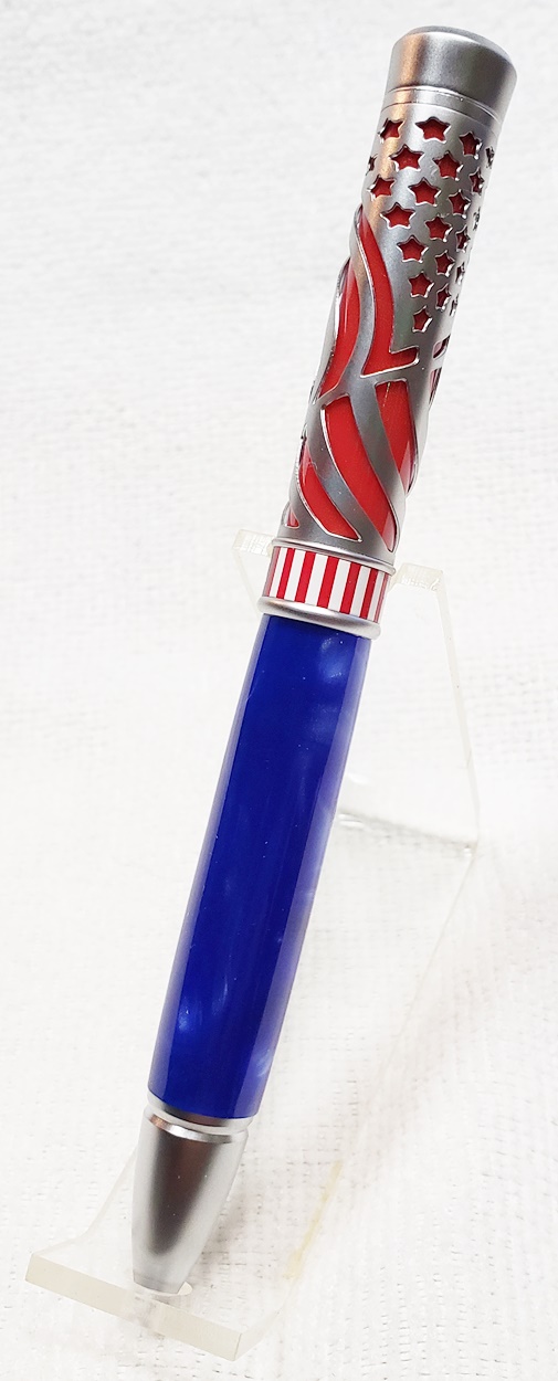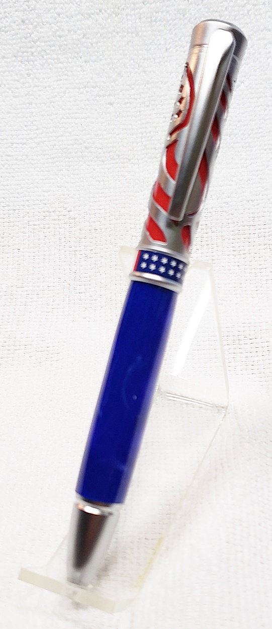 This is an American Pride Filigree pen, in satin chrome, from PSI. The blanks are Football Team Color in red, and Aquabright Royal Blue Dream, both also from PSI. This is my first, and it won't be my last. I really like it, especially the details in the filigree.