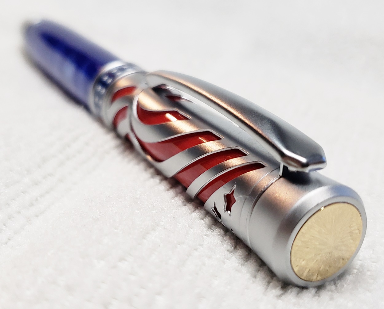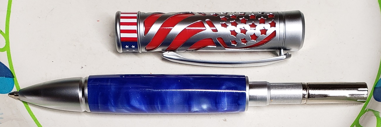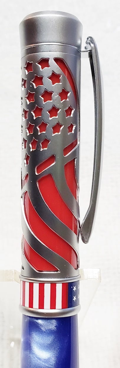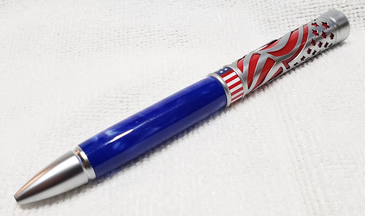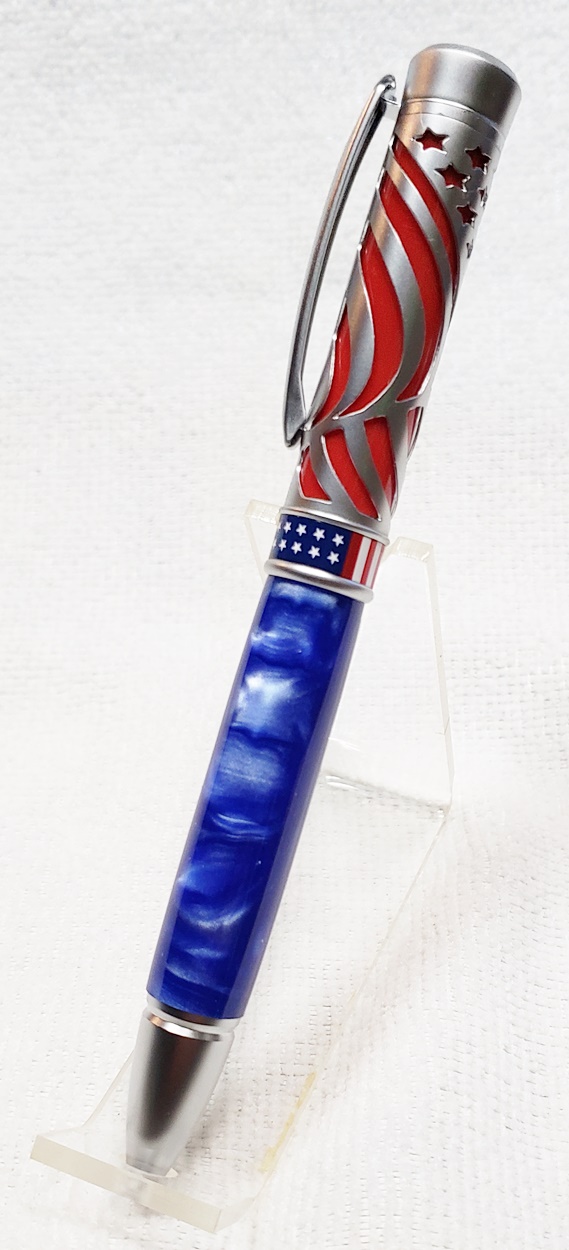 This is an American Pride Filigree pen, in satin chrome, from PSI. The blanks are Football Team Color in red, and Aquabright Royal Blue Dream, both also from PSI. This is my first, and it won't be my last. I really like it, especially the details in the filigree.