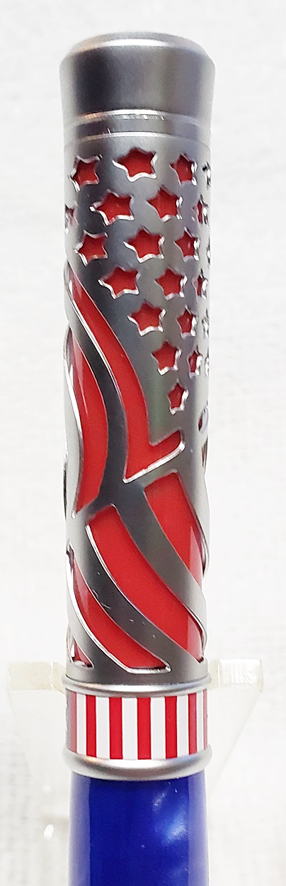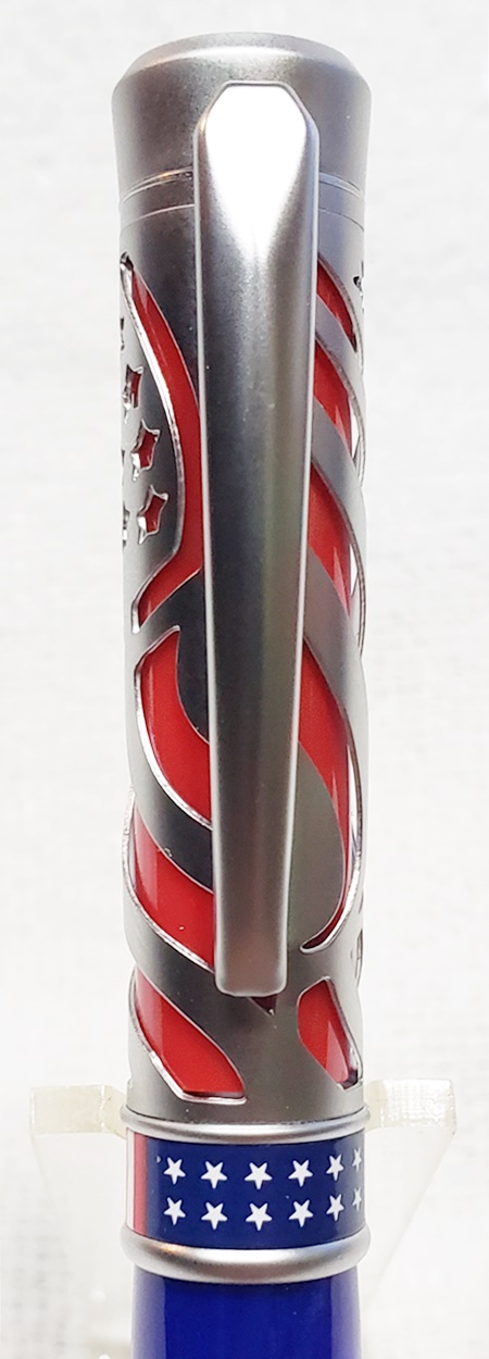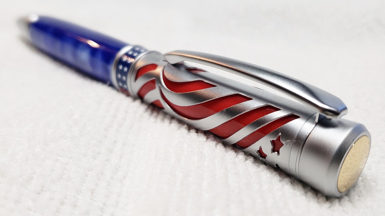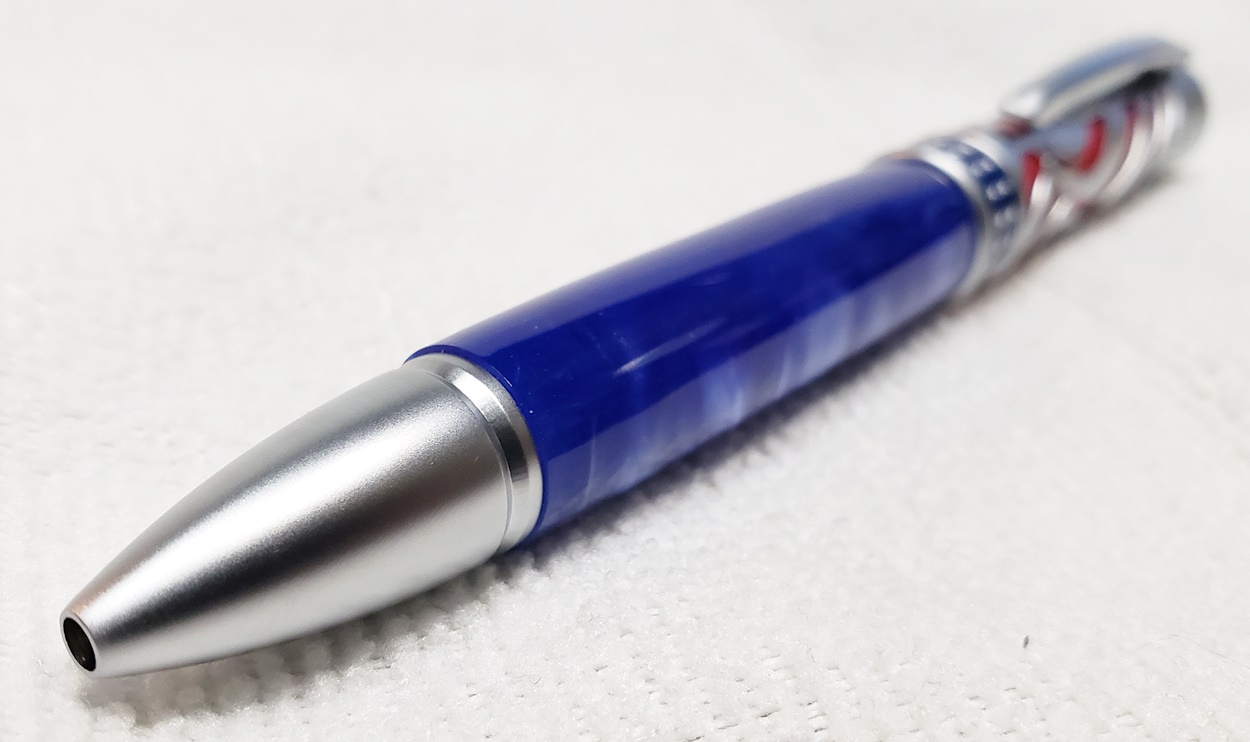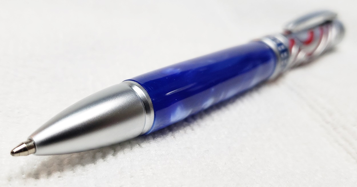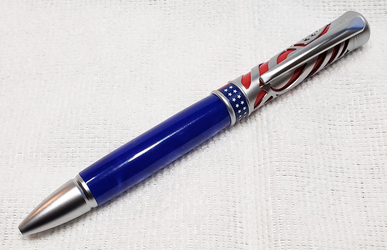This is an American Pride Filigree pen, in satin chrome, from PSI. The blanks are Football Team Color in red, and Aquabright Royal Blue Dream, both also from PSI. This is my first, and it won't be my last. I really like it, especially the details in the filigree.