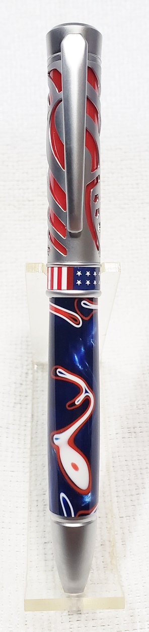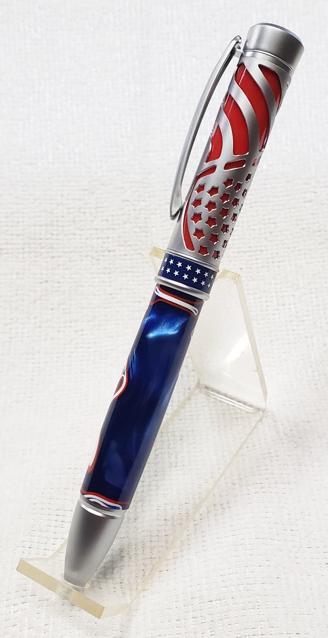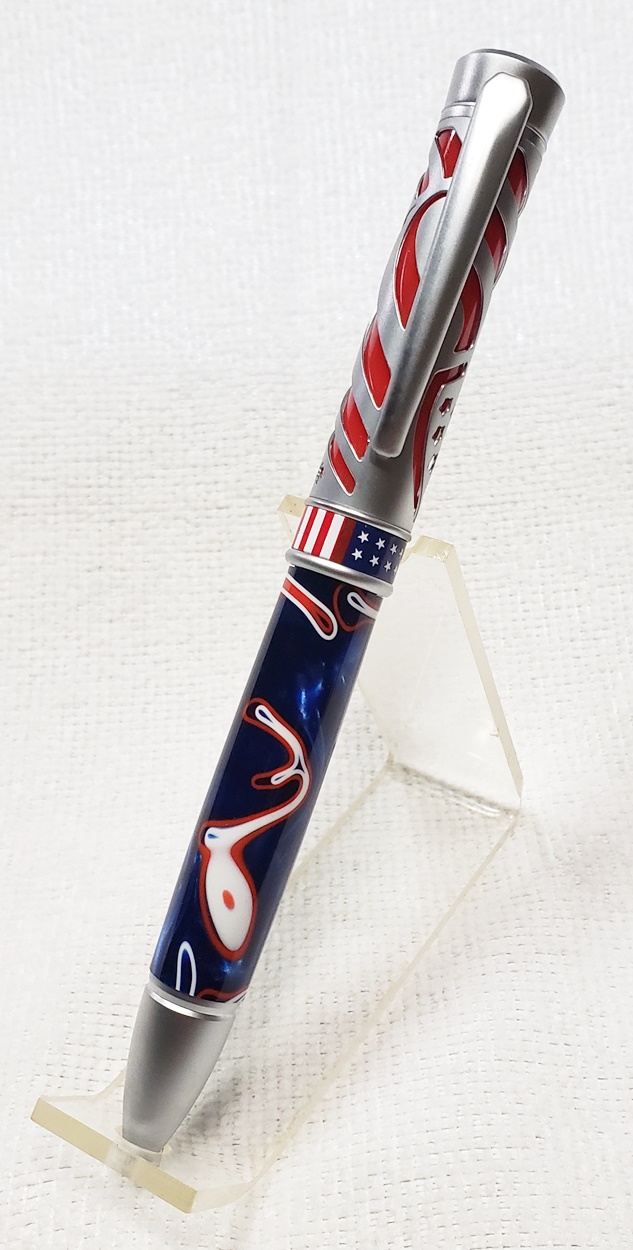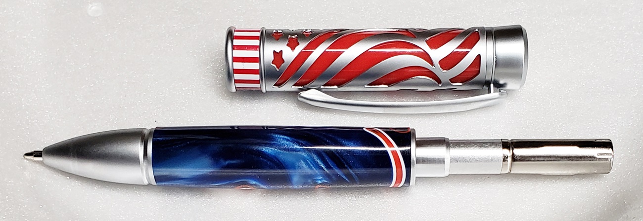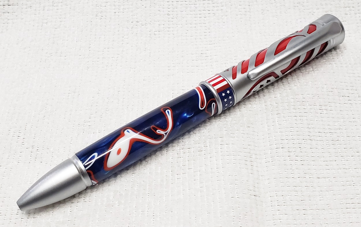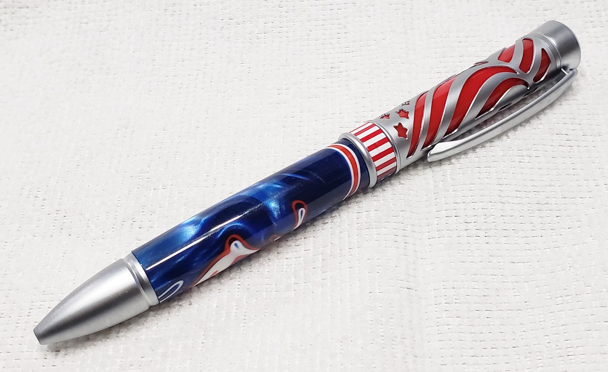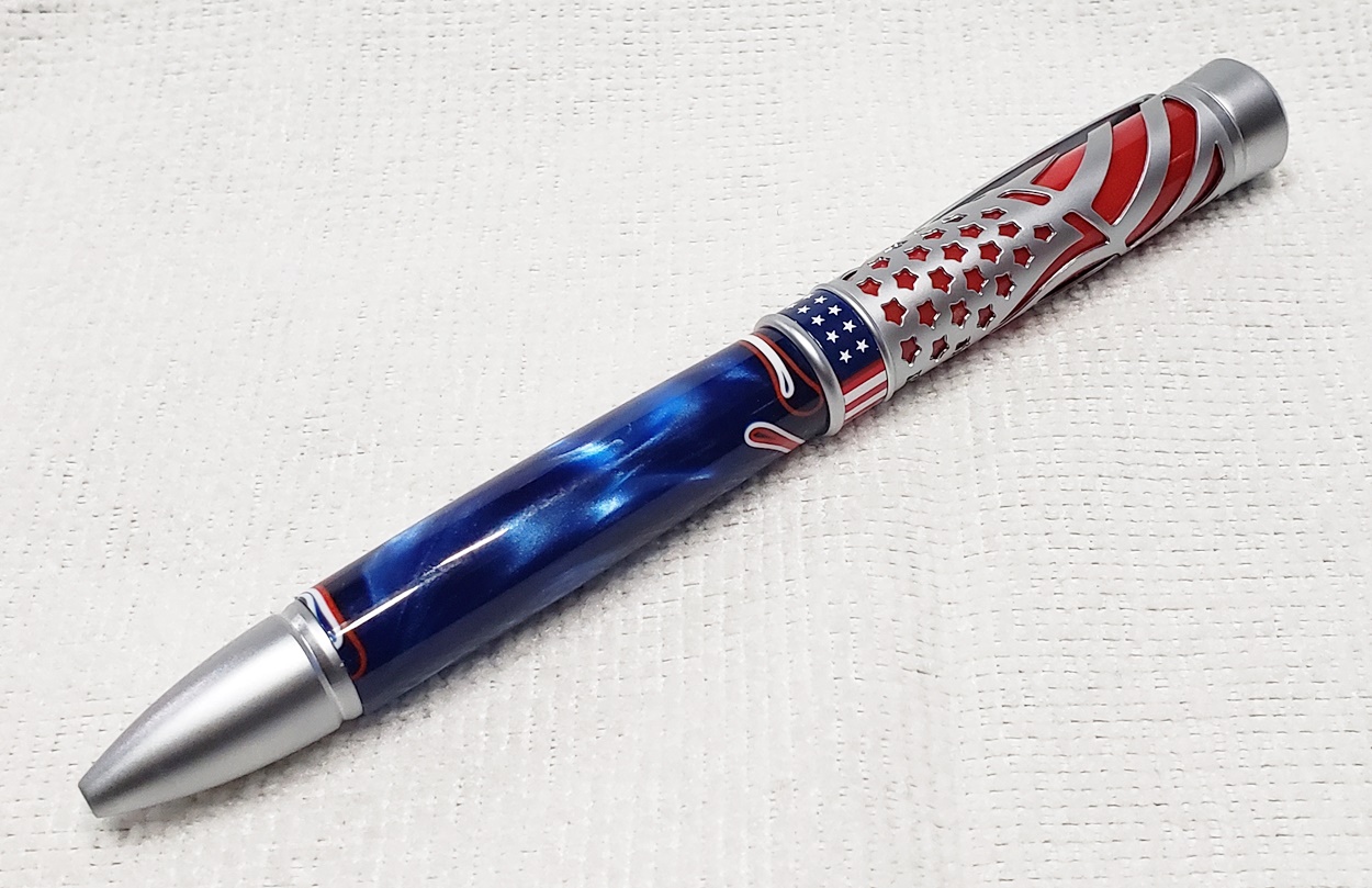 This is a PSI American Pride pen in satin chrome, and is my second. I love love love the details in the filigree! The red, white, and blue blank is a Kirinite Patriot, and looks great with the pen. The red blank is a Football Team Color, also from PSI. Very happy with this one.