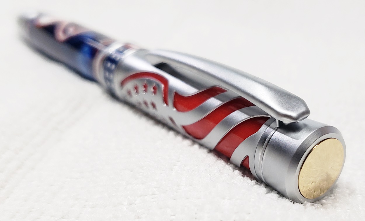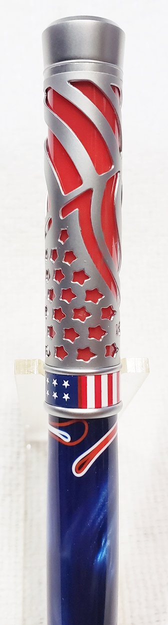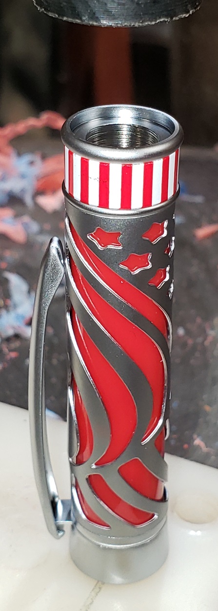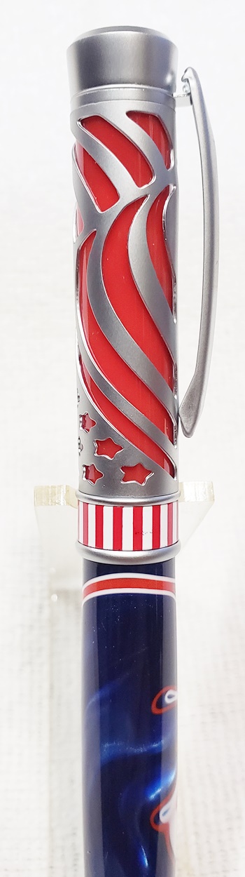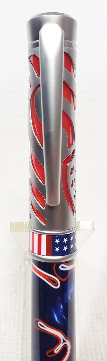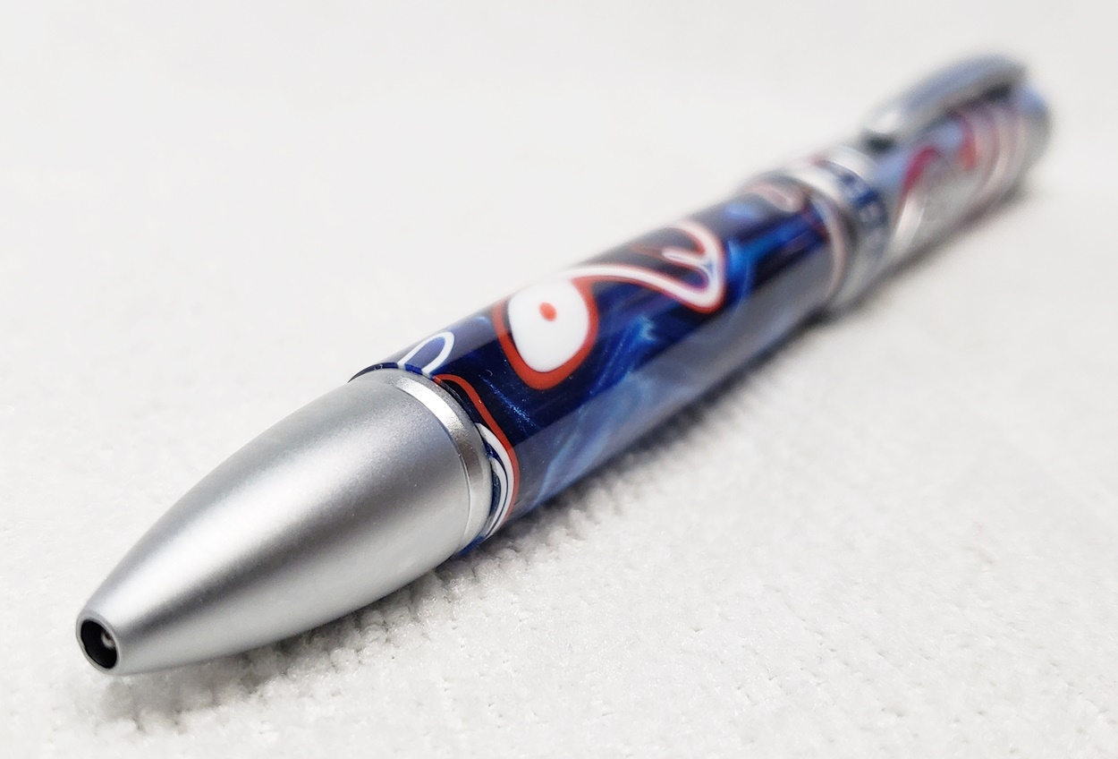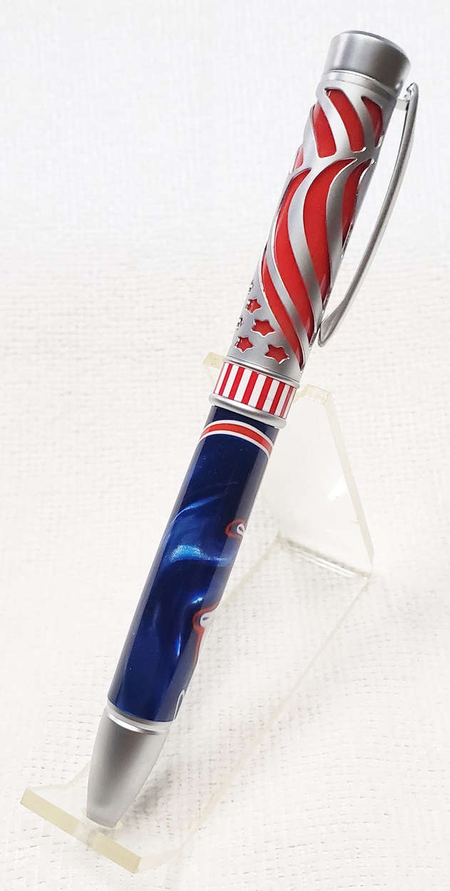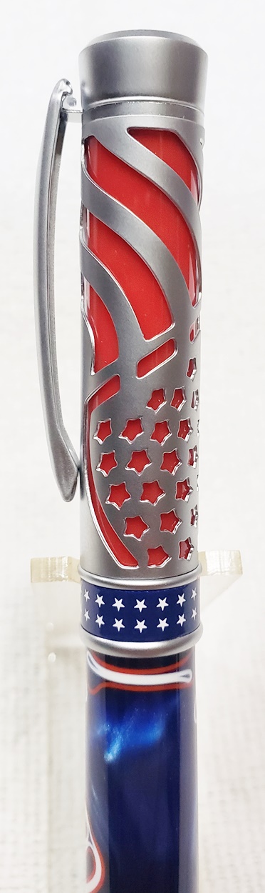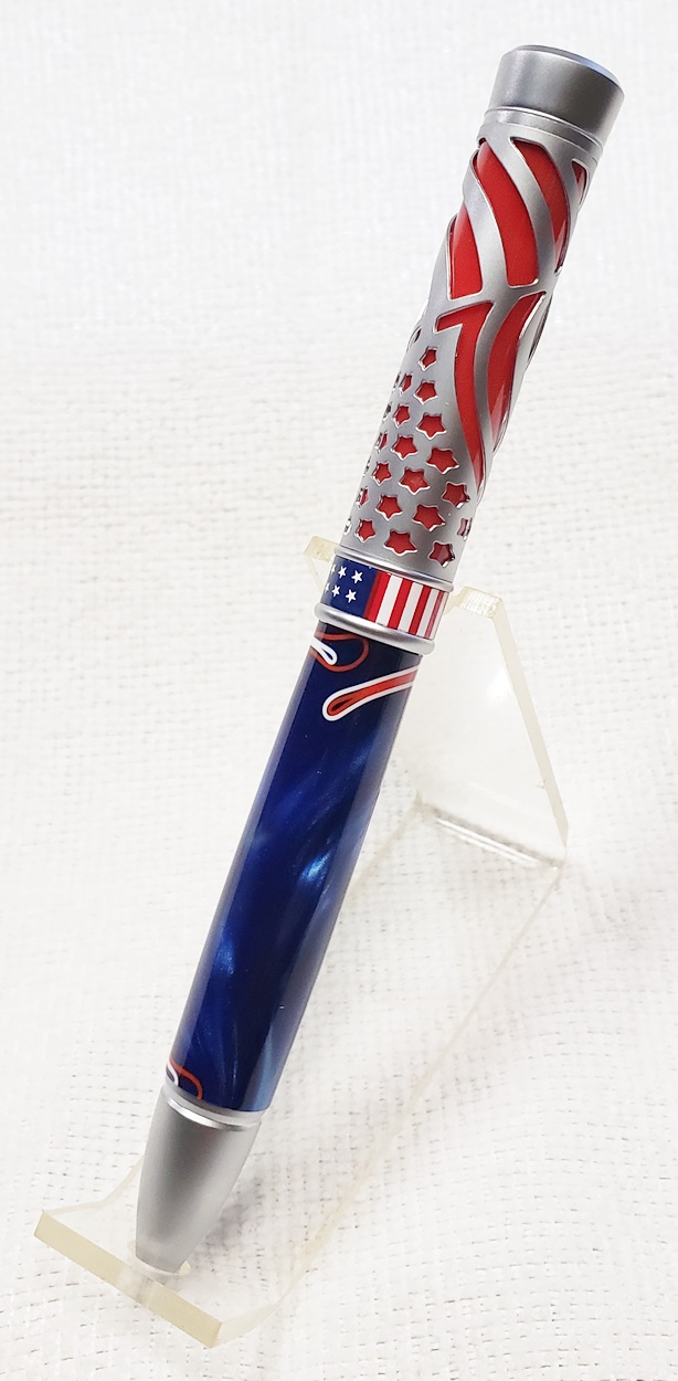 This is a PSI American Pride pen in satin chrome, and is my second. I love love love the details in the filigree! The red, white, and blue blank is a Kirinite Patriot, and looks great with the pen. The red blank is a Football Team Color, also from PSI. Very happy with this one.