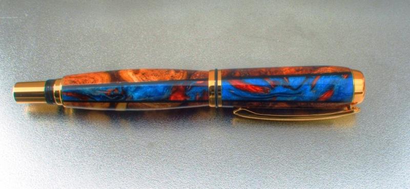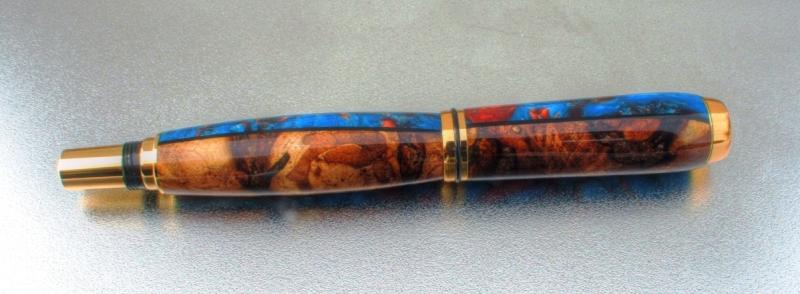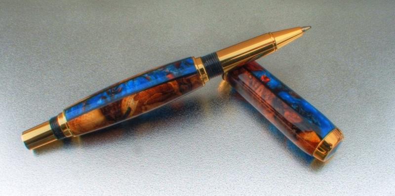 The other day PARSONS posted his Amboyna/Malachite Segmented Jr. Statesman and I was really Impressed with it so I decided to give a try. This is Dawns Ancient Mars and Mesquite Burl on a Gold Jr Gent. This was really fun to make, the hardest part is getting every thing even when sanding the saw marks smooth. I had to do a lot of back filling on the burl due to worms. It has a CA finish that has been wet sanded to 6K then plastic polished, inside of the blank was painted white.