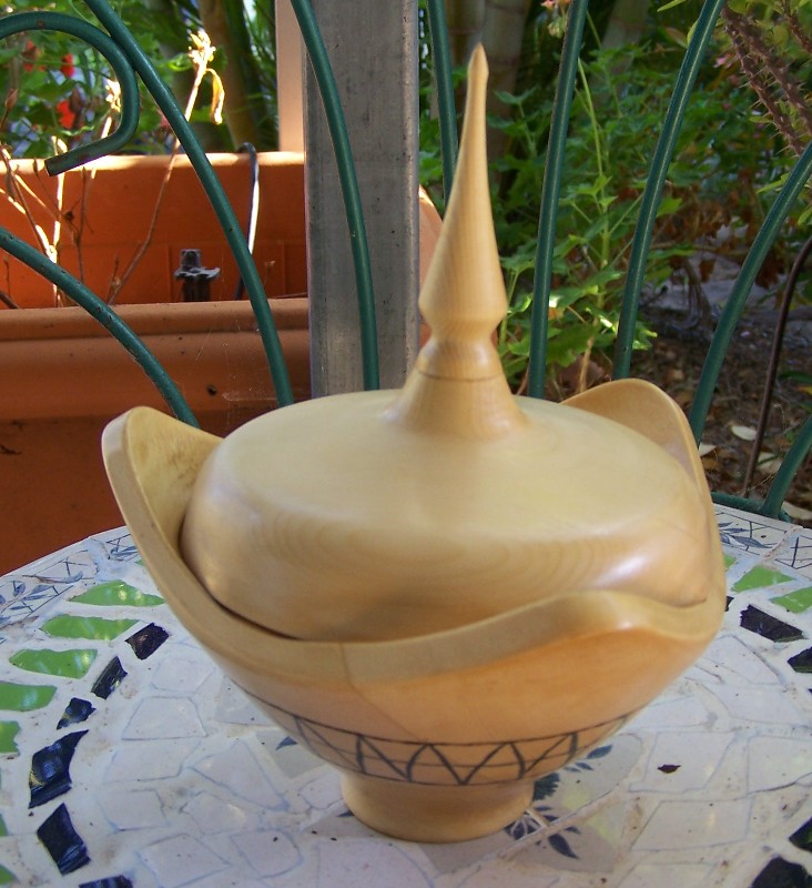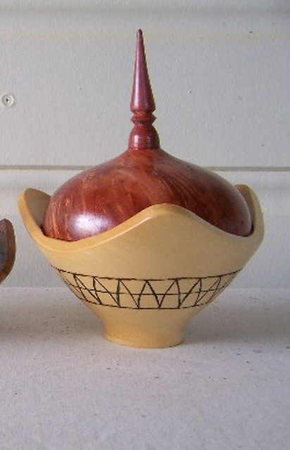 I was given some pieces of Canadian yellow cedar so glued them together and made this in April last year. The yellow part is made from a cube. The Cedar was pretty bland so I made the top from Figured Tasmanian Myrtle.