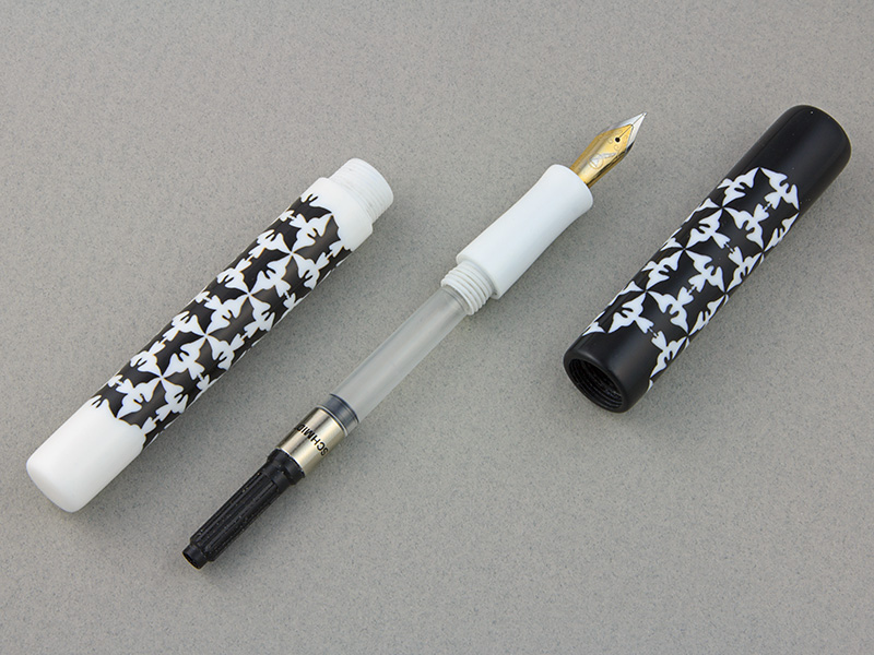 This was my first kitless pen of this style. My initial attempts at the grip section failed (mostly in tapping threads for the feed, but also in cutting other threads). After figuring out the correct order of operations, and learning to keep a very light touch when tapping, however, I succeeded. I turned both black and white grips for the pen, and decided to keep the white one.