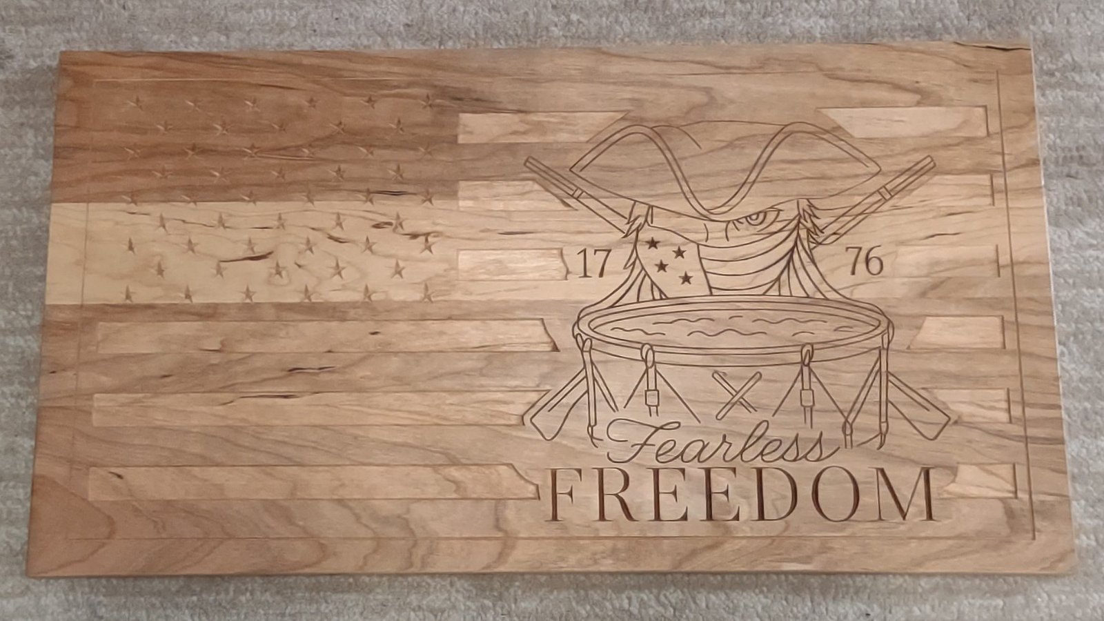 The flag was done on my CNC, the wood is Cherry with a spray lacquer finish. The image on the plaque was part of the art work from their poster.