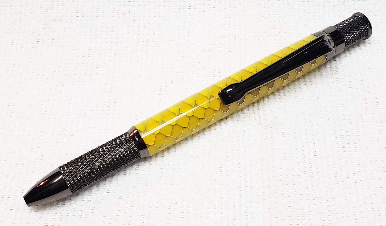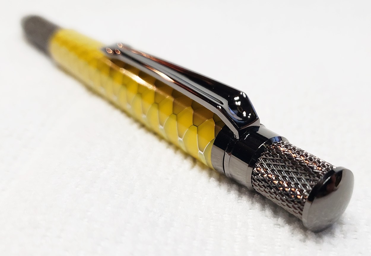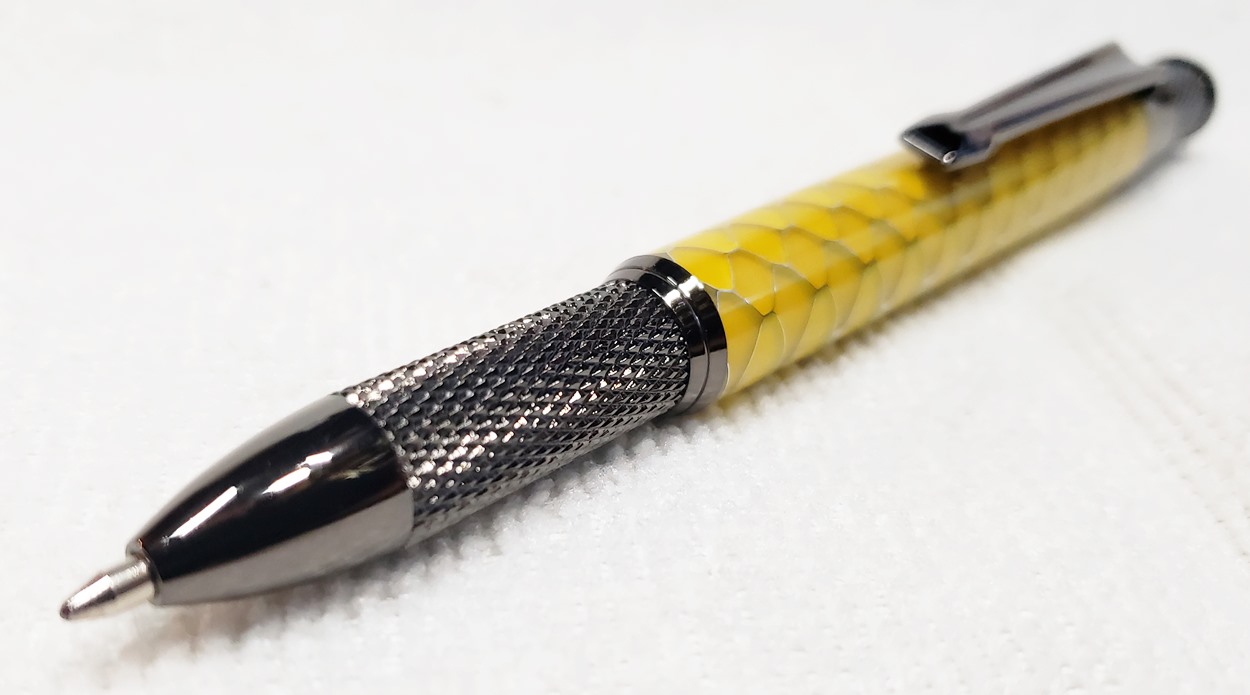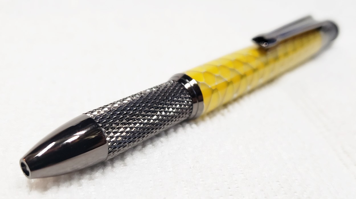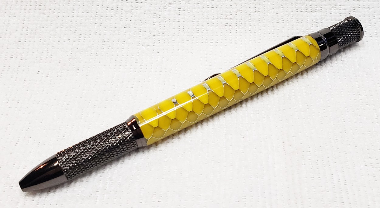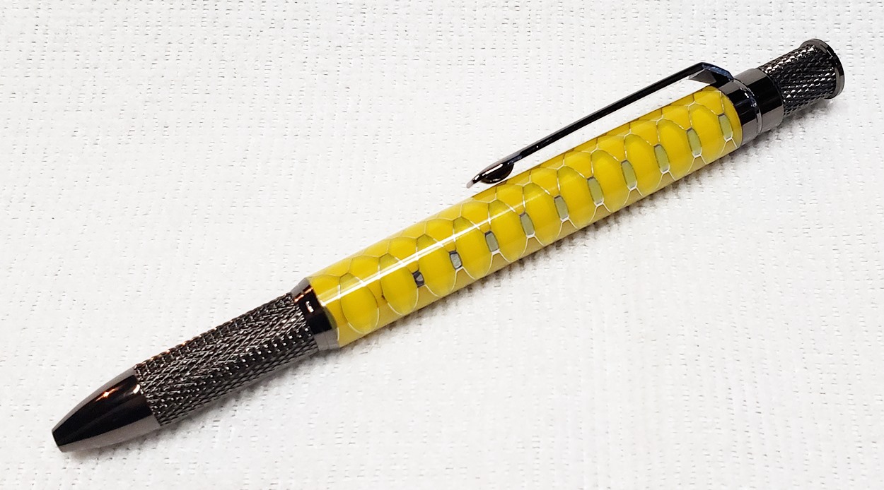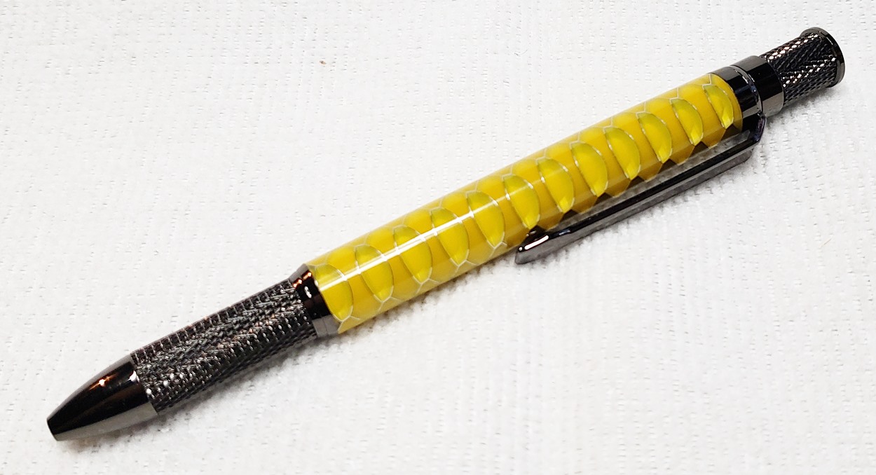 This is an Annular pen, in gunmetal, from Crooked Mill. It's identical to the PSI Knurl GT. I'm not sure why they chose the name Annular, it means "ring-shaped". But whatever. The blank is a yellow Honeycomb from Woodcraft. I've turned other Honeycomb blanks, in blue and red. I didn't know if I'd like the yellow, but I do.