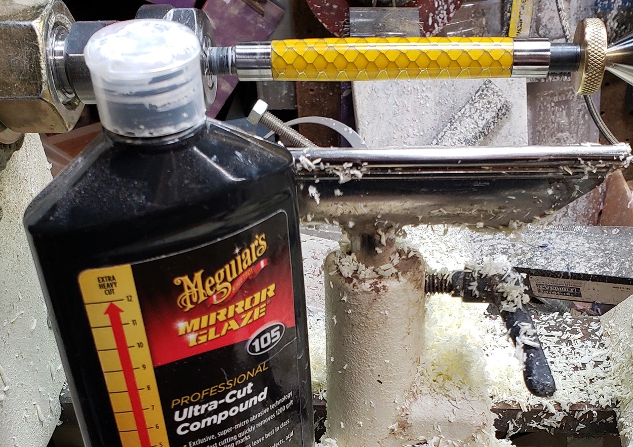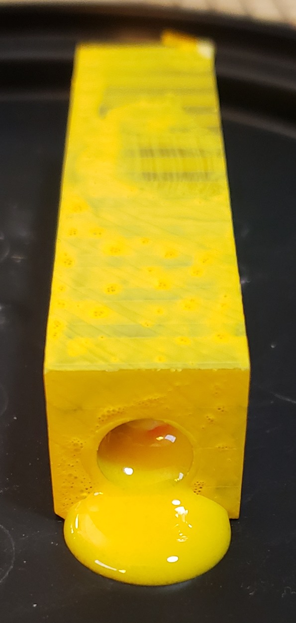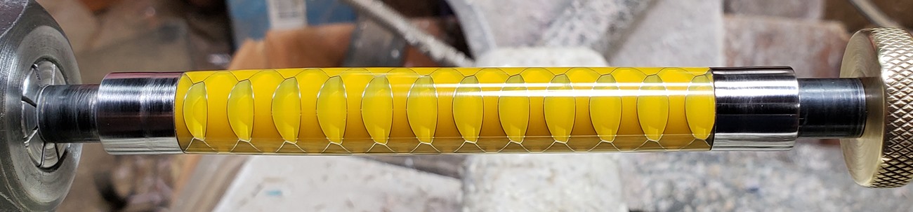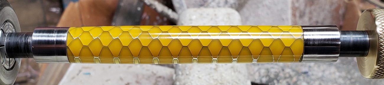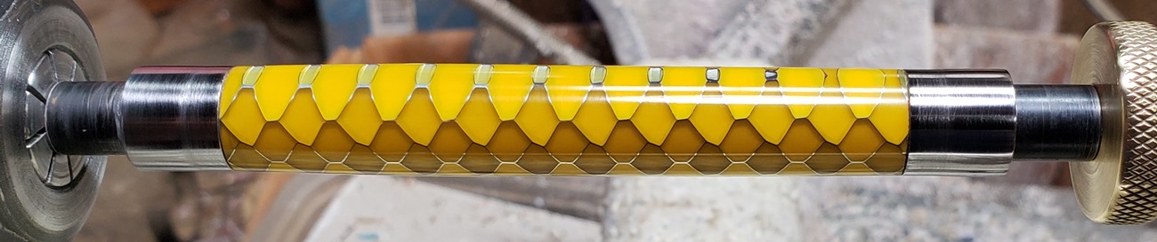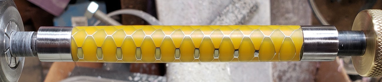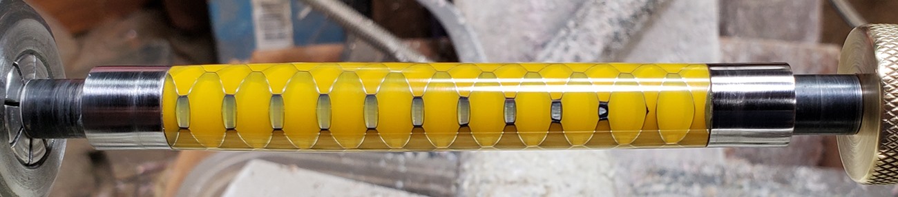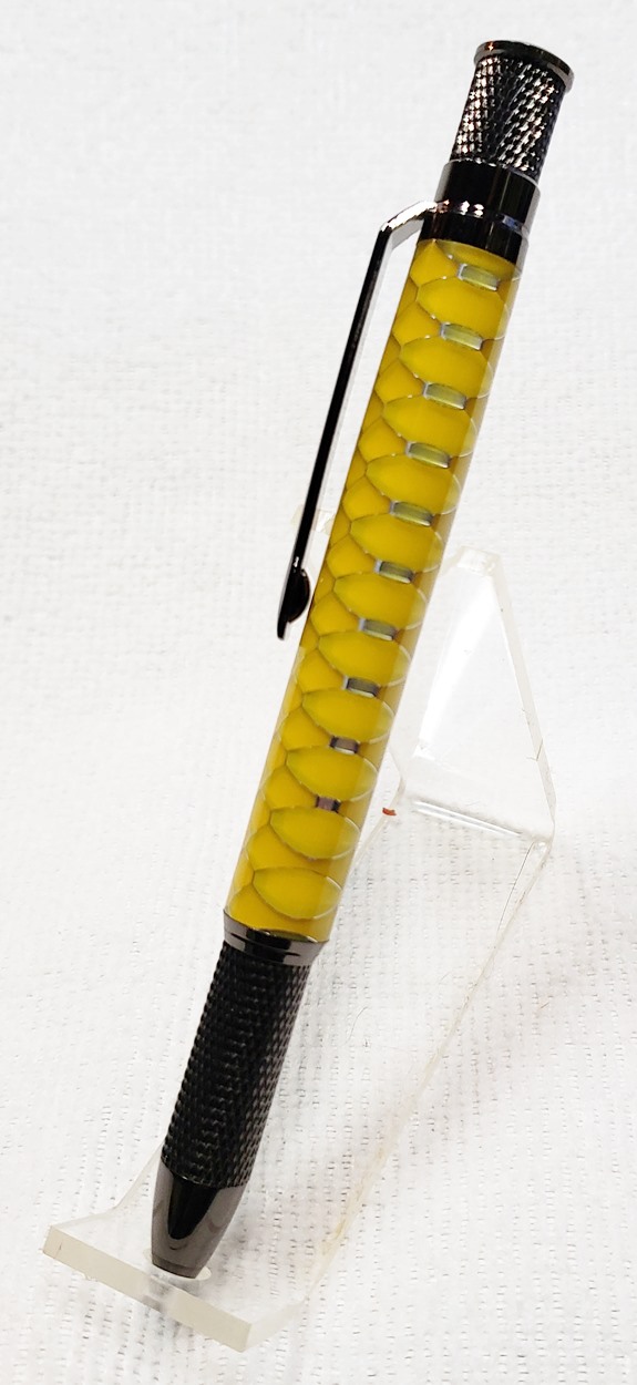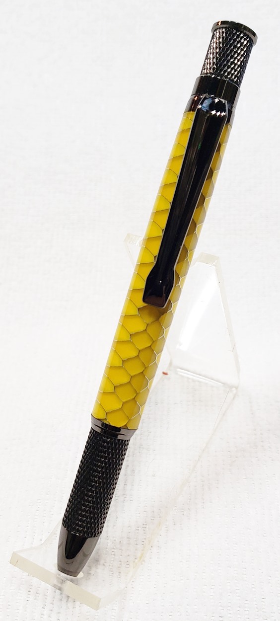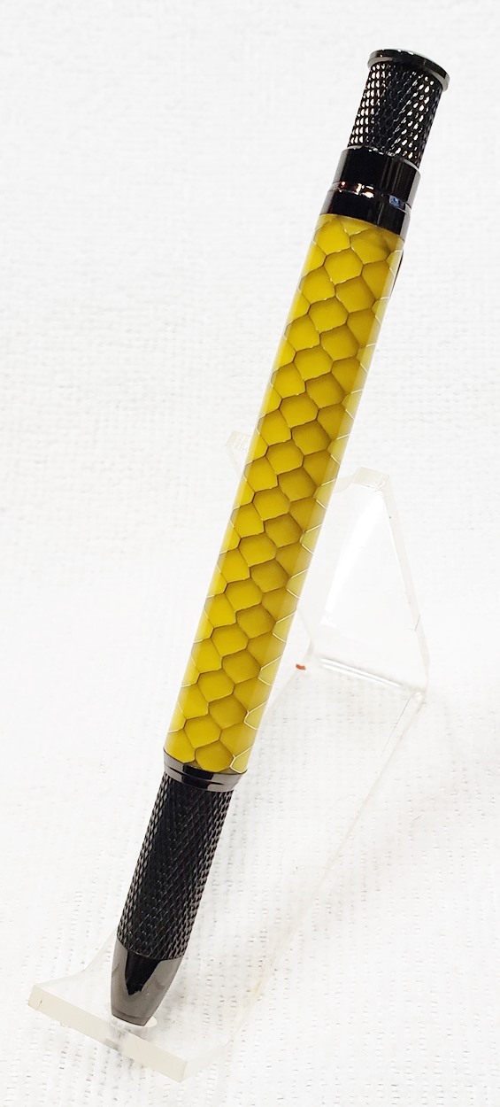 This is an Annular pen, in gunmetal, from Crooked Mill. It's identical to the PSI Knurl GT. I'm not sure why they chose the name Annular, it means "ring-shaped". But whatever. The blank is a yellow Honeycomb from Woodcraft. I've turned other Honeycomb blanks, in blue and red. I didn't know if I'd like the yellow, but I do.
