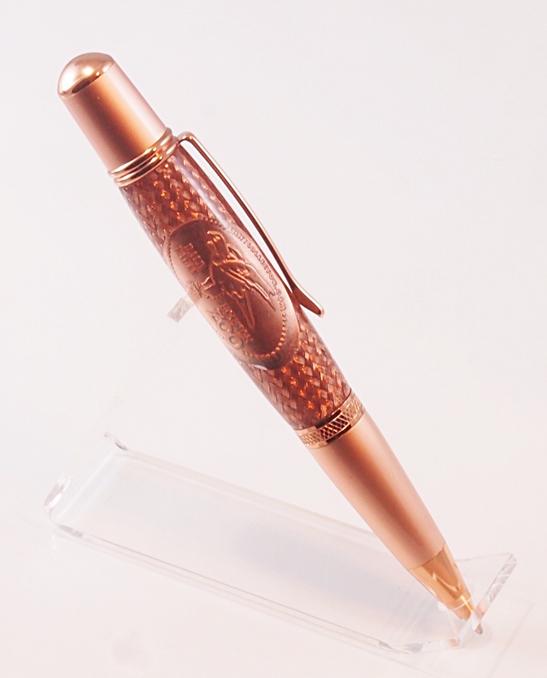 My last pressed penny from the Houston zoo cast on a braided copper sleeve. Bald eagle on a copper Sierra Vista.