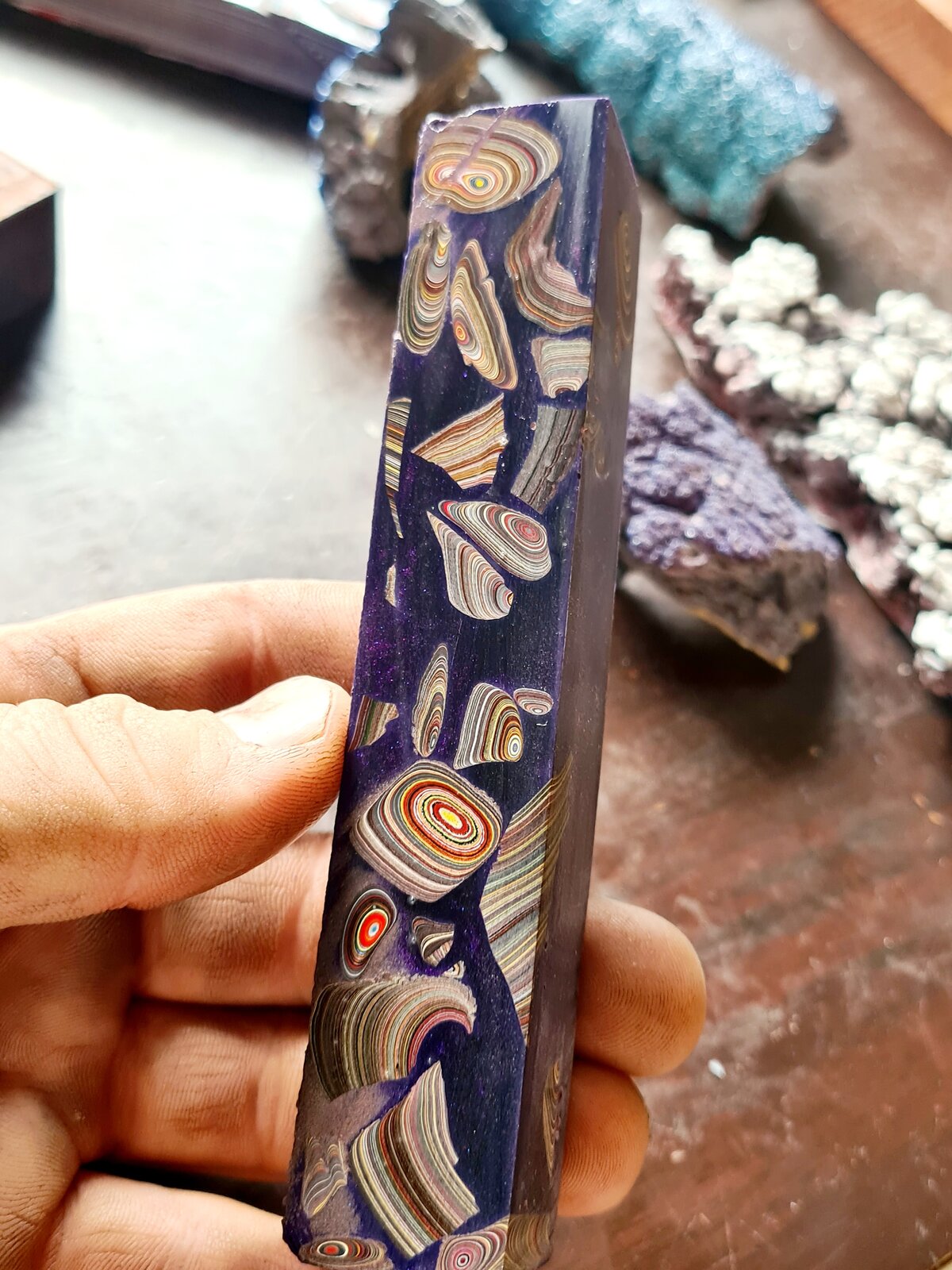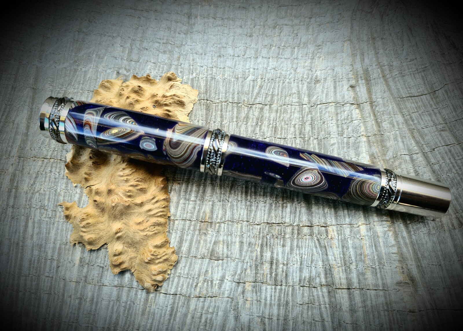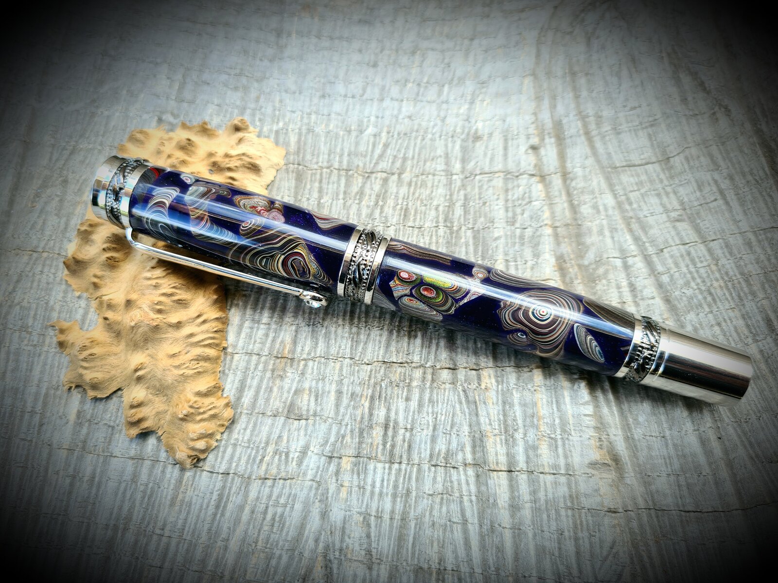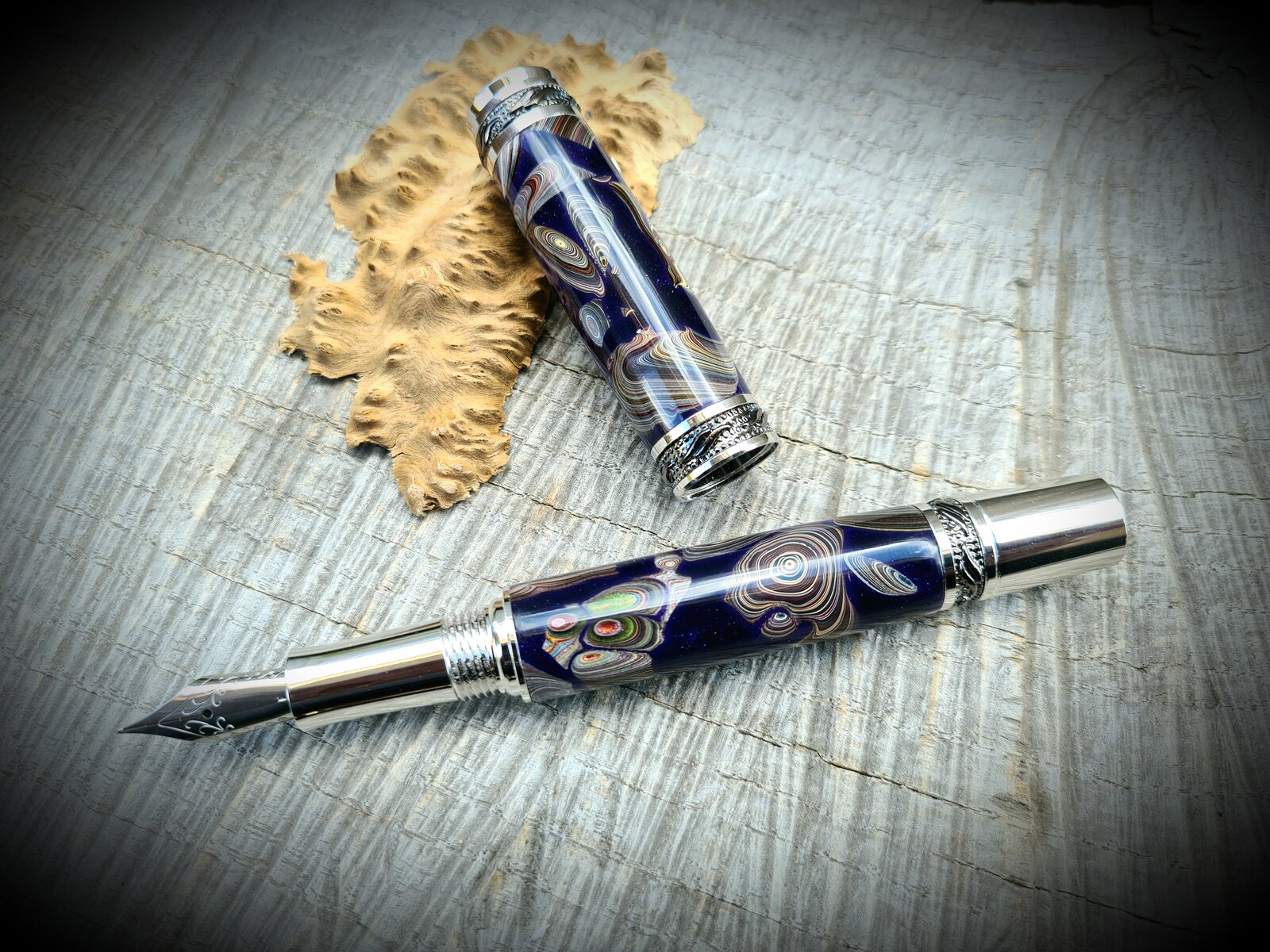 So recently I purchased 2 corvette hybrids from the states for quite alot of money. Corvette fordite is quite rare and very collectable. This one was cast in purple and looks great! There are green sections which I haven't seen before. Very cool. On a black titanium majestic fountain pen with upgraded jowo ef nib.