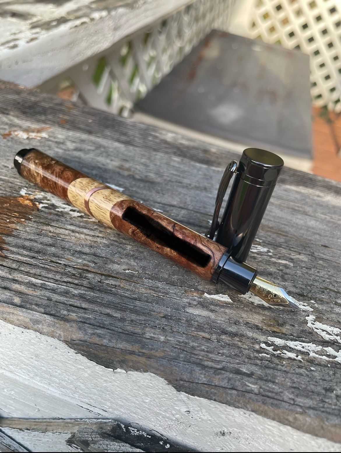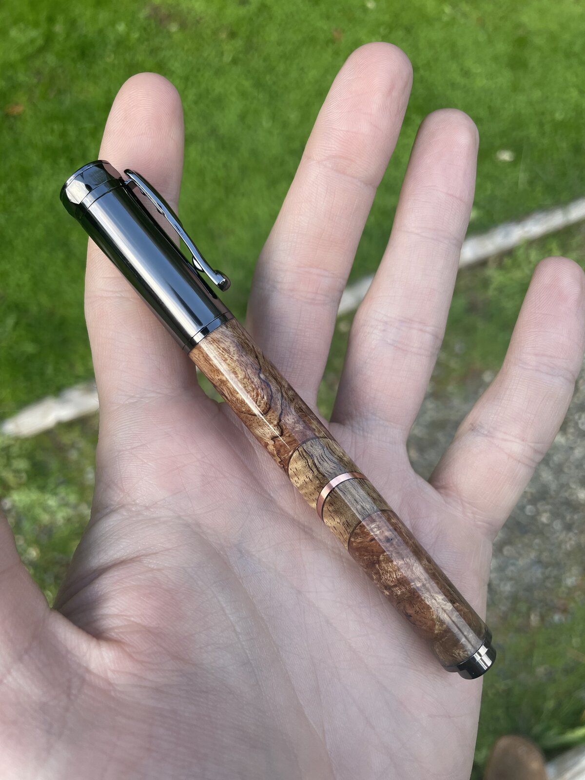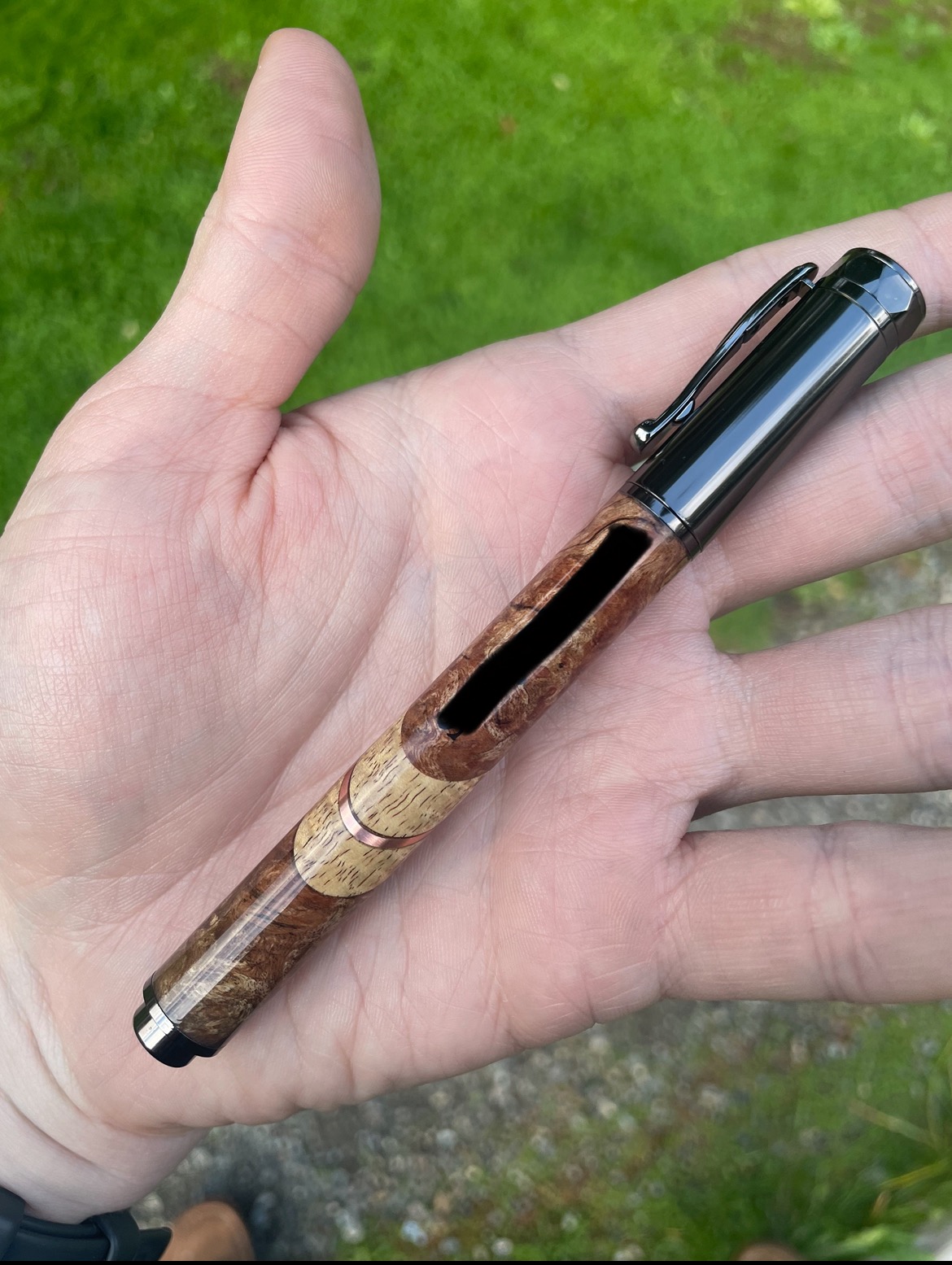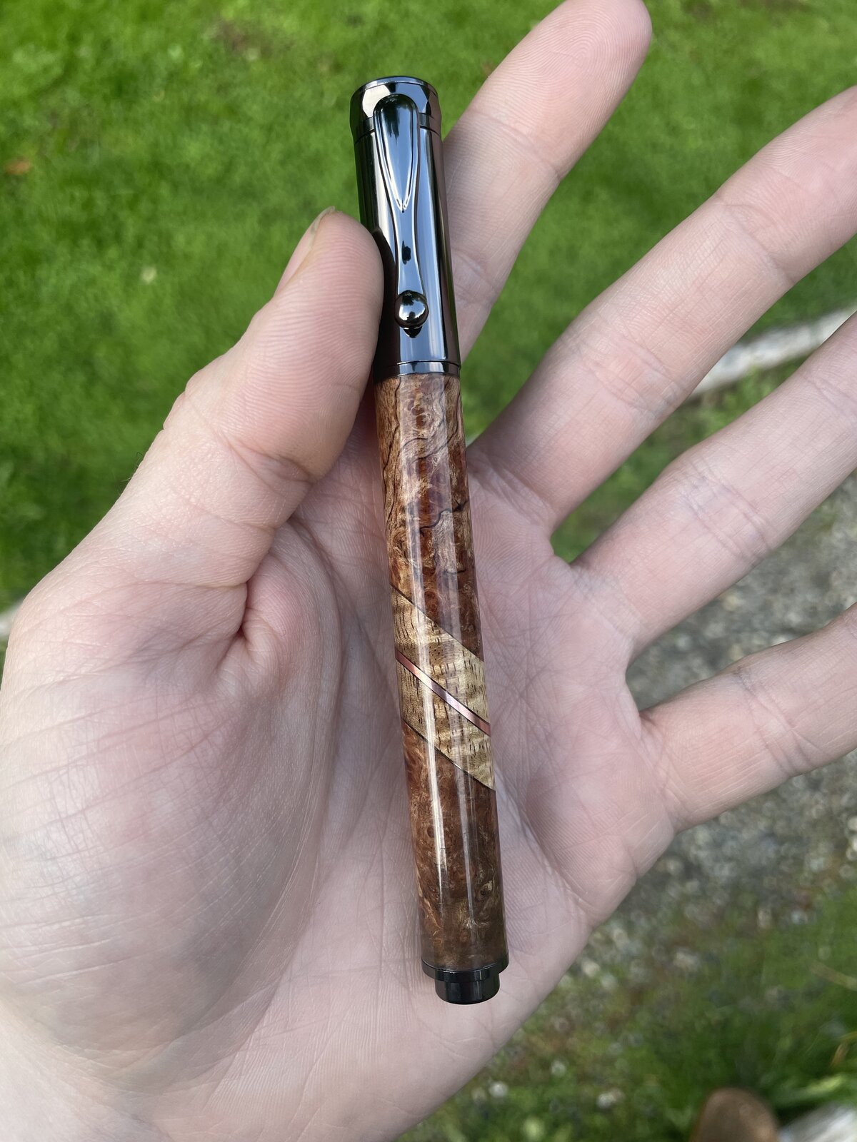 I'd tell yall the story behind this pen…but you wouldn't believe me…. Caribbean Rosewood Burl, curry Koa, and copper. Engraving redacted.