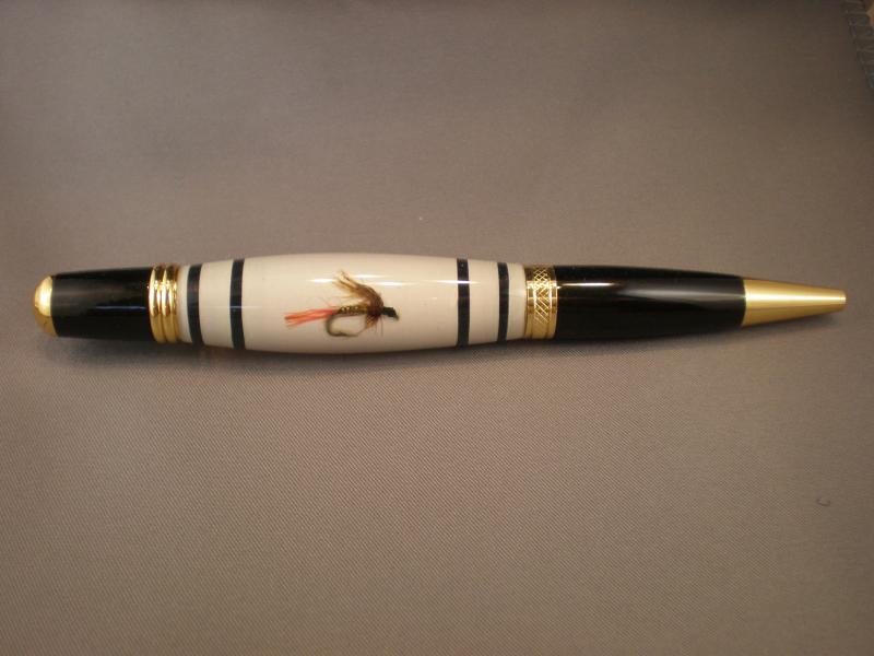 This is a fishing fly mounted on a tube wrapped with the same thread used to mount the eyes and handles on fishing poles. I got the idea of a fly off an IAP thread and I thought I'd try putting it on top of a wrapped tube. Thanks for looking and all comments welcome.