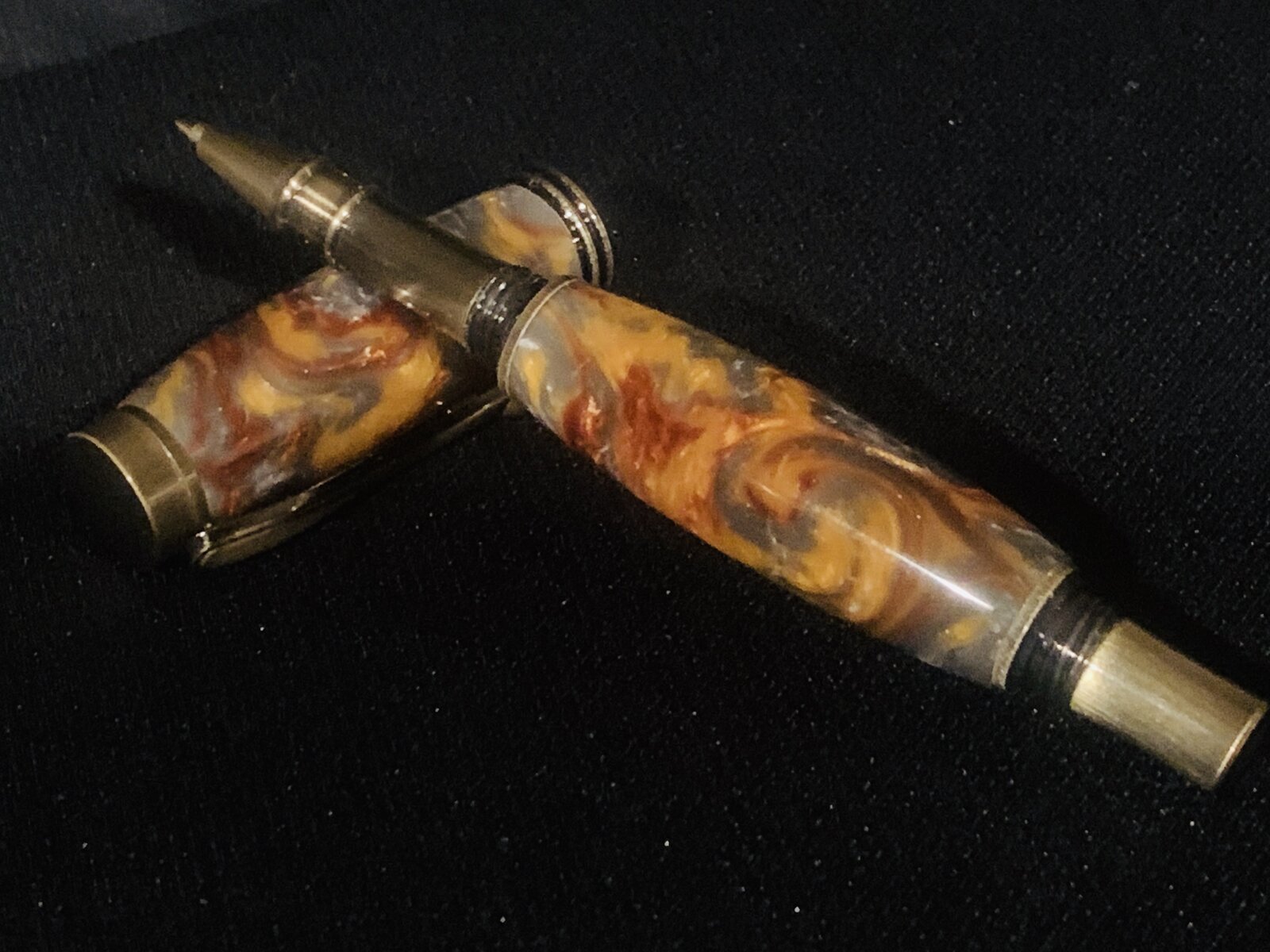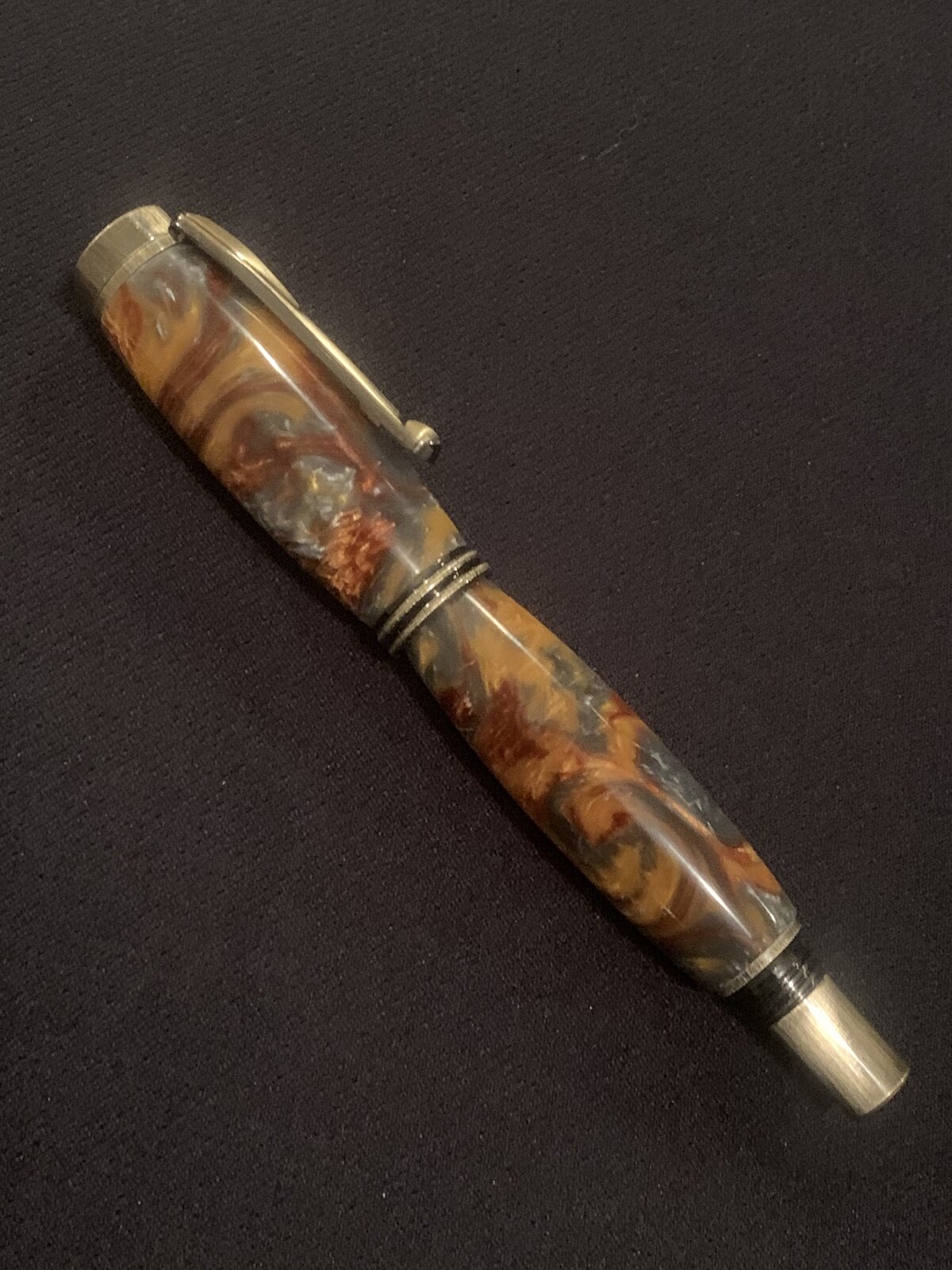 I just finished a Rollerball pen for another senior graduating from high school. The school colors are maroon and gold. I used the Molten Metal acrylic pen blank with the Modesto Rollerball pen kit in Antique brass.