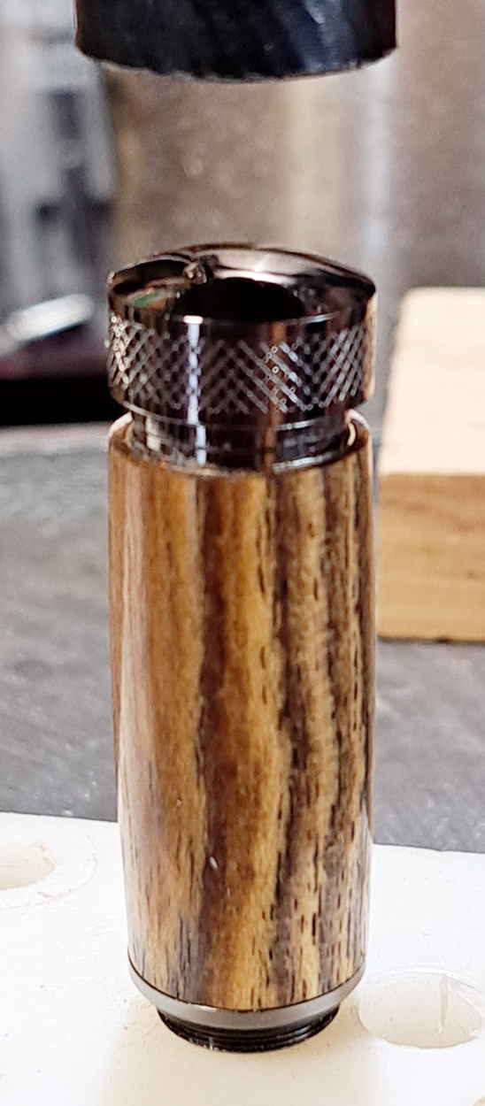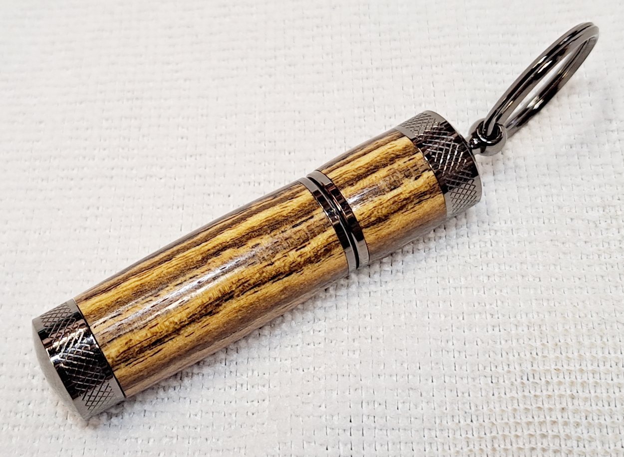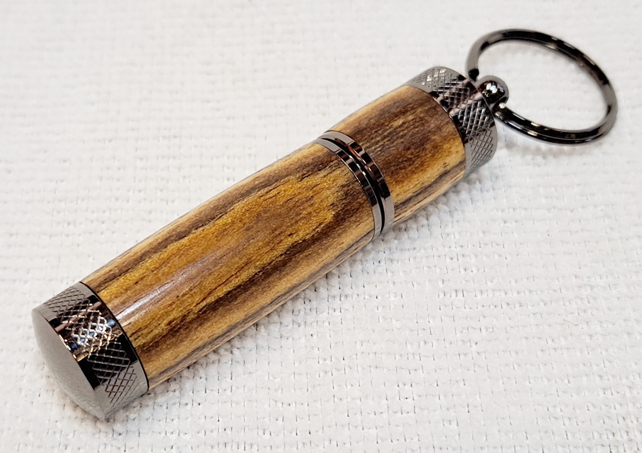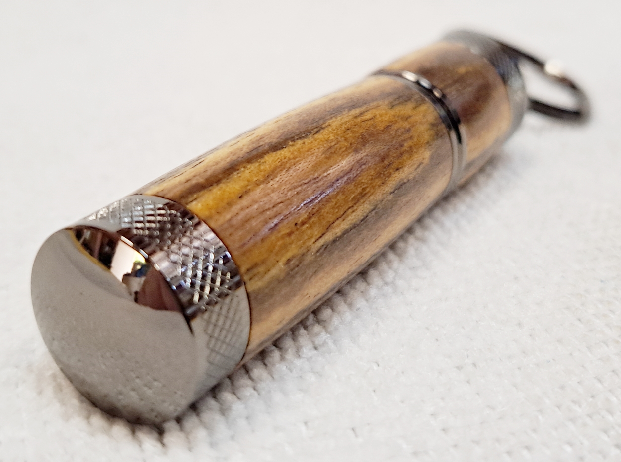 My second Keyring Lighter from Woodturners Warehouse, also gunmetal. And another piece of nicely figured bocote. The finish is Pens Plus and carnuba wax. I think I've decided I don't like this kit. It's too tedious and annoying. I still have a chrome kit, but at this point I'm not very interested in making it.
