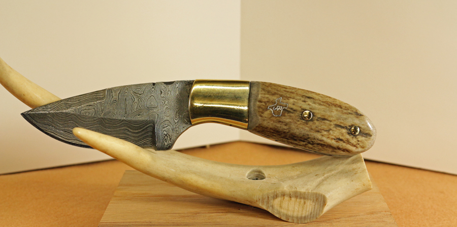 My step-son has, 30 yrs old, has been checking out my knives and sheaths I made. He really likes the skinner style. So I surprised him with one this wknd I did this past week. It's antler handle with a bought Damascus blade. I tried a little something different with the sheath and added fringe to it. I also put my brand on the rear and his name on the front of the handle (engraved with my neje3500).