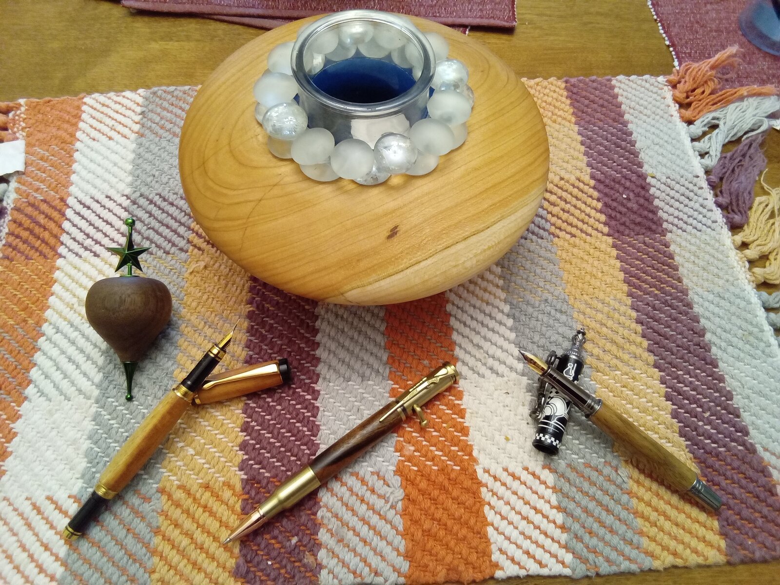 Chess themed fountain pen is Shawshank Tree oak, antique brass 30 cal is bobinga, classic fountain pen is two toned granadillo, ornament is walnut and votive holder is hickory with blue resin and glass pebbles.