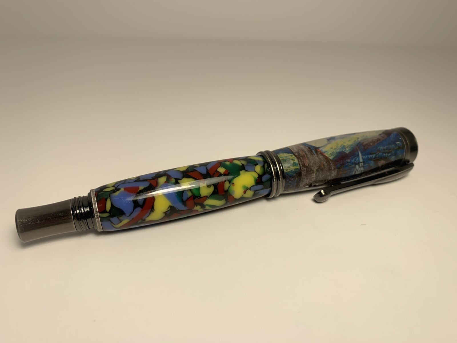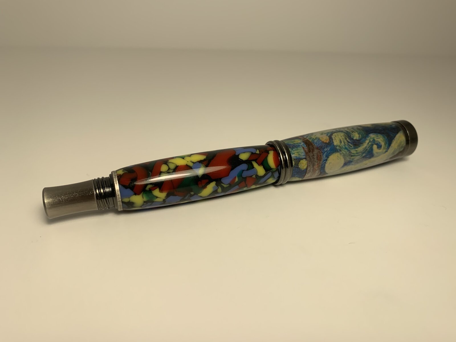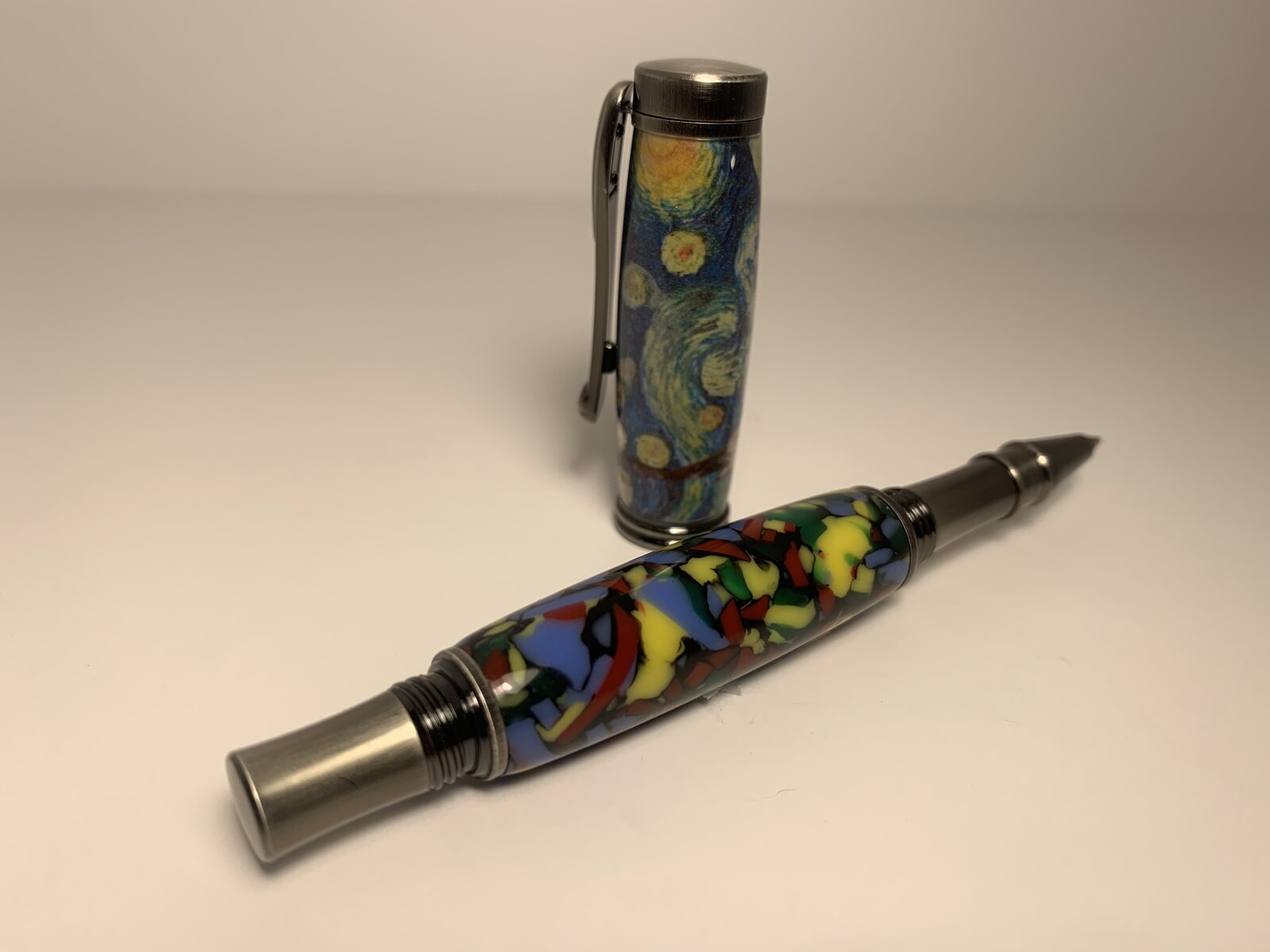 Here is another tribute to great works of art and their artists. This one is Starry Night by Van Gogh. The blank is Starry Night Acrylic blank, and the pen kit is a Modesto Antique Silver Roller Ball. I was first inspired by the blank itself since all of the colors of the painting were represented. When I completed the pen I soon realized how busy the pen looked, and how the vivid colors of the blank upstaged the featured art work. Great looking blank but I think something more subtle would work better. Let me know what you think.