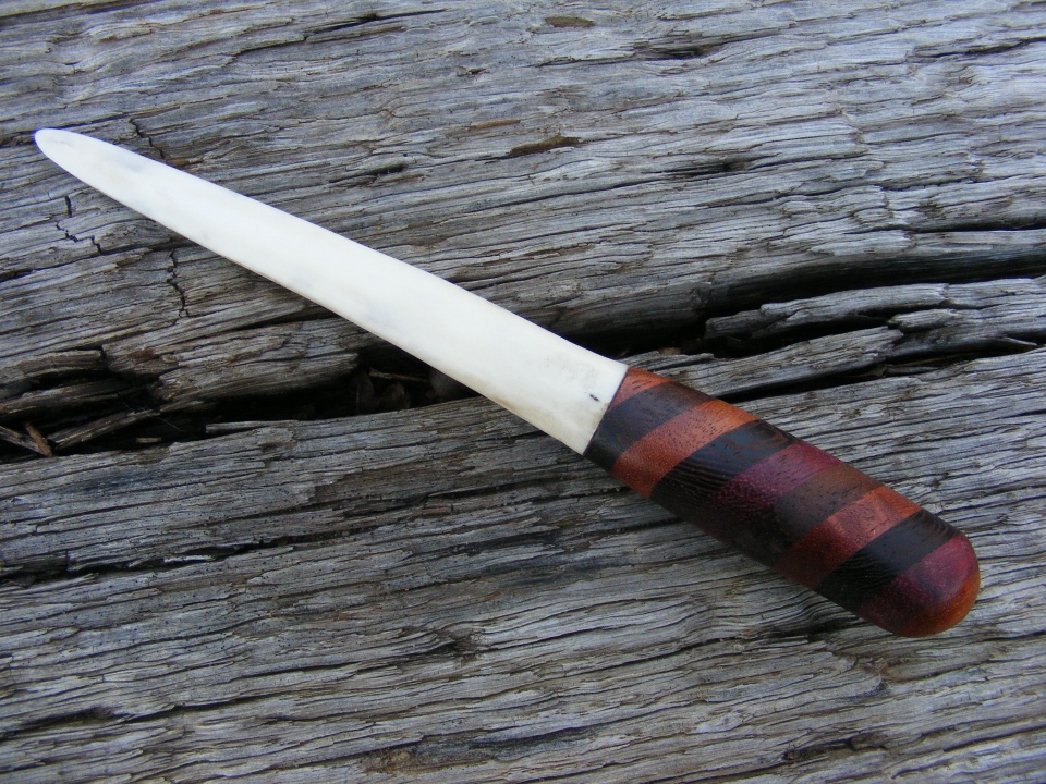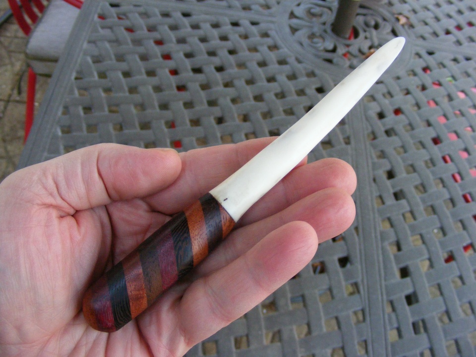 My son and daughter were kidding me that this looked like a prison shank. My first response was how did they know anything about prison shanks -- LOL. Anyway, this is 100% intended to be an antler letter opener. I took a straight antler tine and joined it with a leftover pen blank. Used a 7mm pen tube and CA glue to join them. Sanded into a rough profile with my 1 inch belt sander from Harbor Freight. Then I sanded by hand with sandpaper and micro mesh. I finished the wood with some Danish Oil. Thanks for looking!