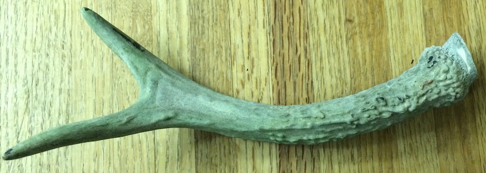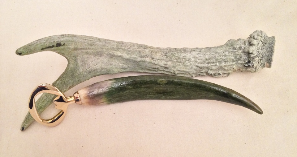 I sliced off the tip of one of the grey antlers, drilled a 7mm hole in the cut end, shaped it against a sanding belt, and wiped on boiled linseed oil.